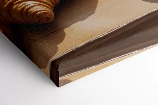 Maalid Soe kohvitass tõusva auruga, asetatud lauale sarvesaia kõrvale, vaatega ajaloolisele hoonele Nr s40405