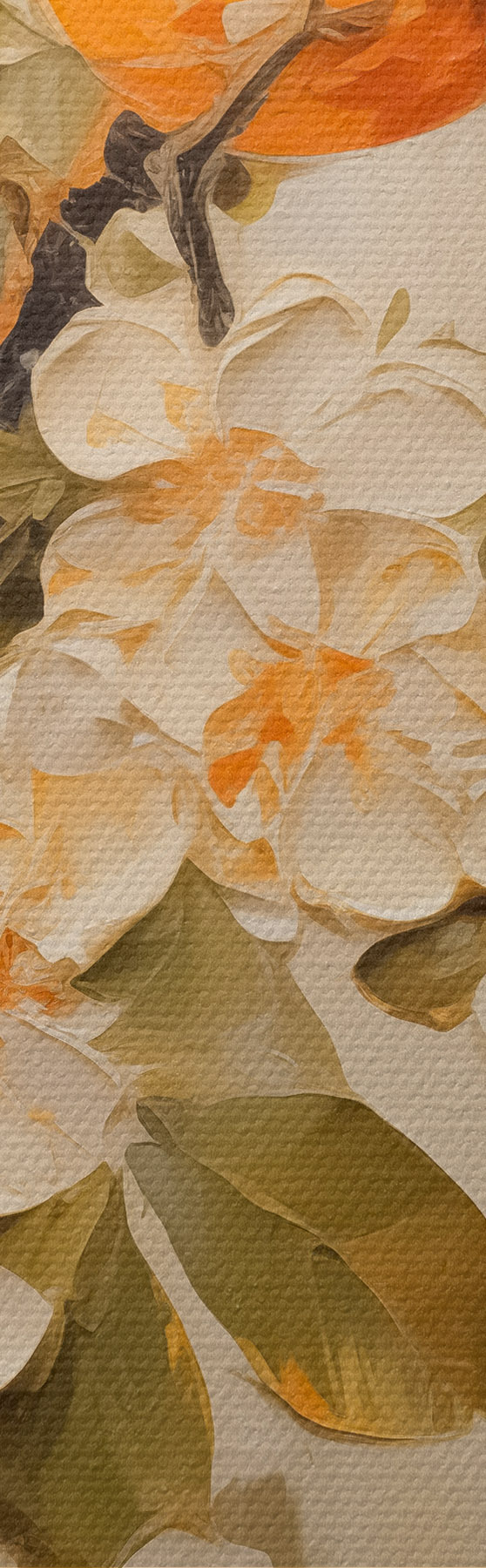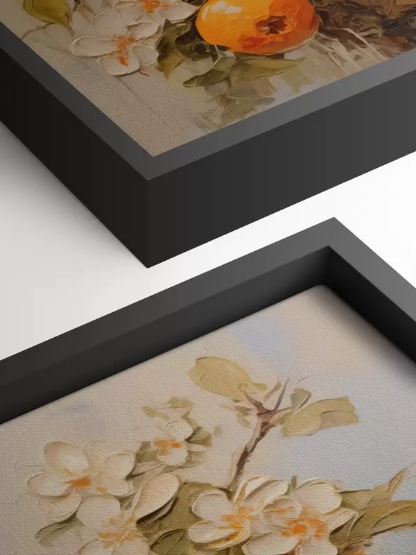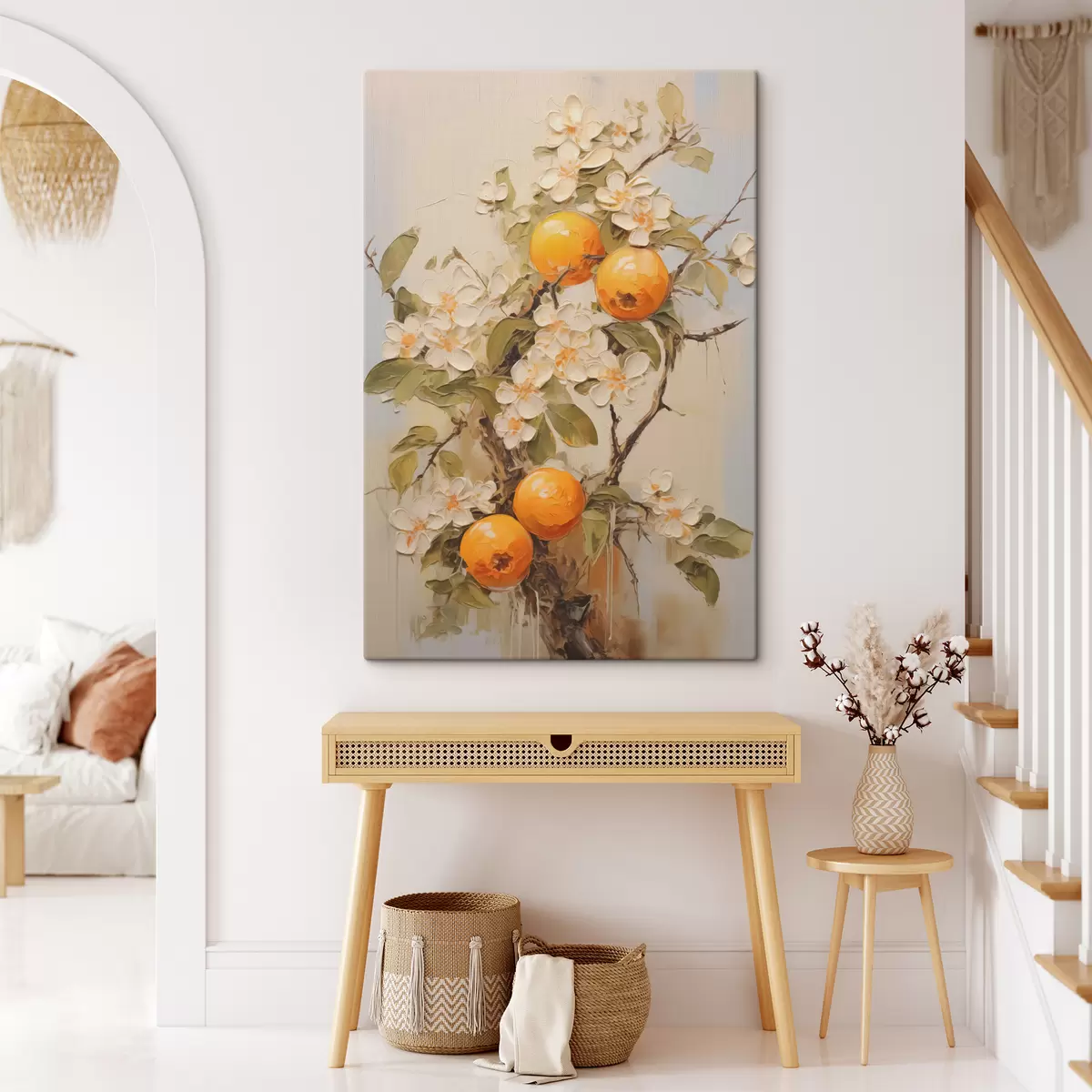 Maalid Valgete lillede ja apelsinidega oks hallikasbeežil taustal Nr s40486
