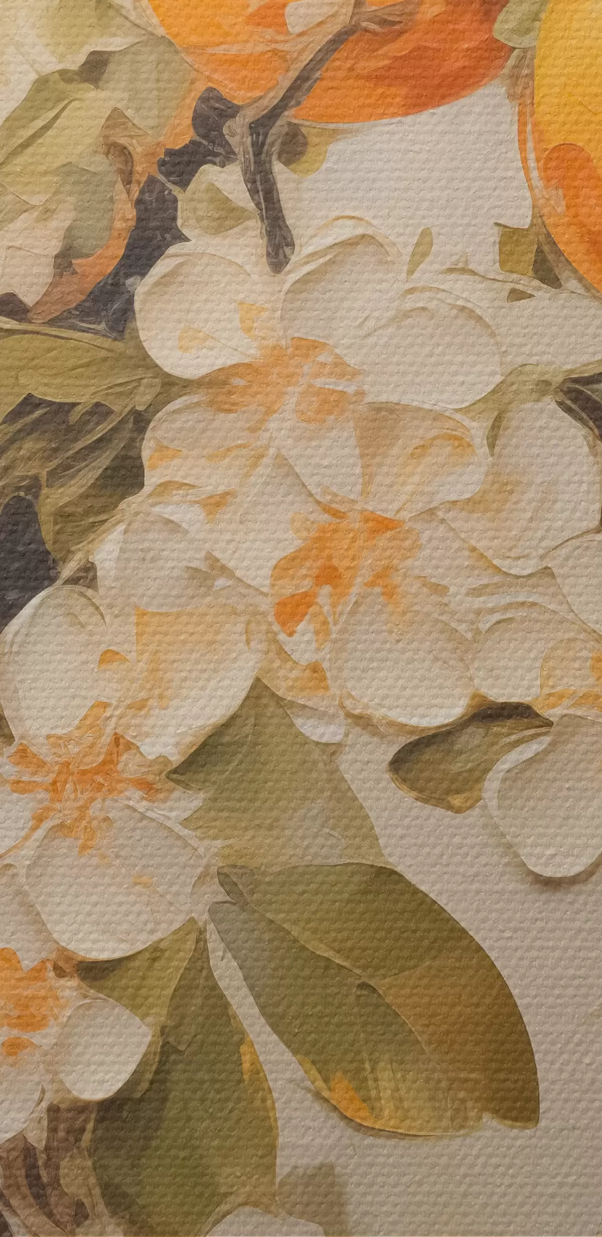 Maalid Valgete lillede ja apelsinidega oks hallikasbeežil taustal Nr s40486