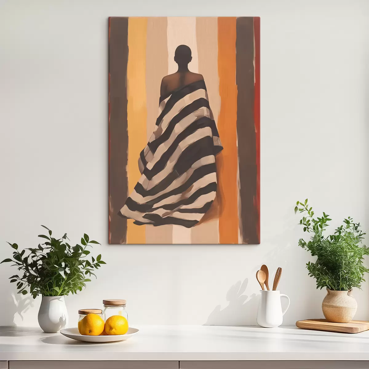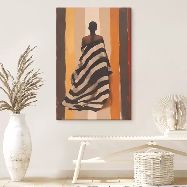 Maalid Aafrika ameeriklanna siluett triibulise keebiga taustal vertikaalsete triipudega, must, beež, kollane, punane, pruun Nr s40487