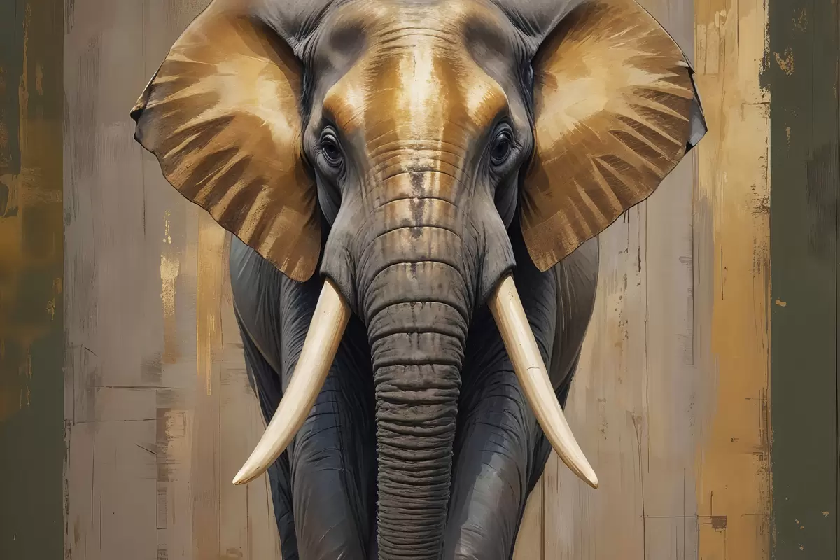 Maalid Suur tekstureeritud Aafrika elevandimaal puidust taustal elevandiluust kihvade ja laienevate kõrvadega Nr s40544