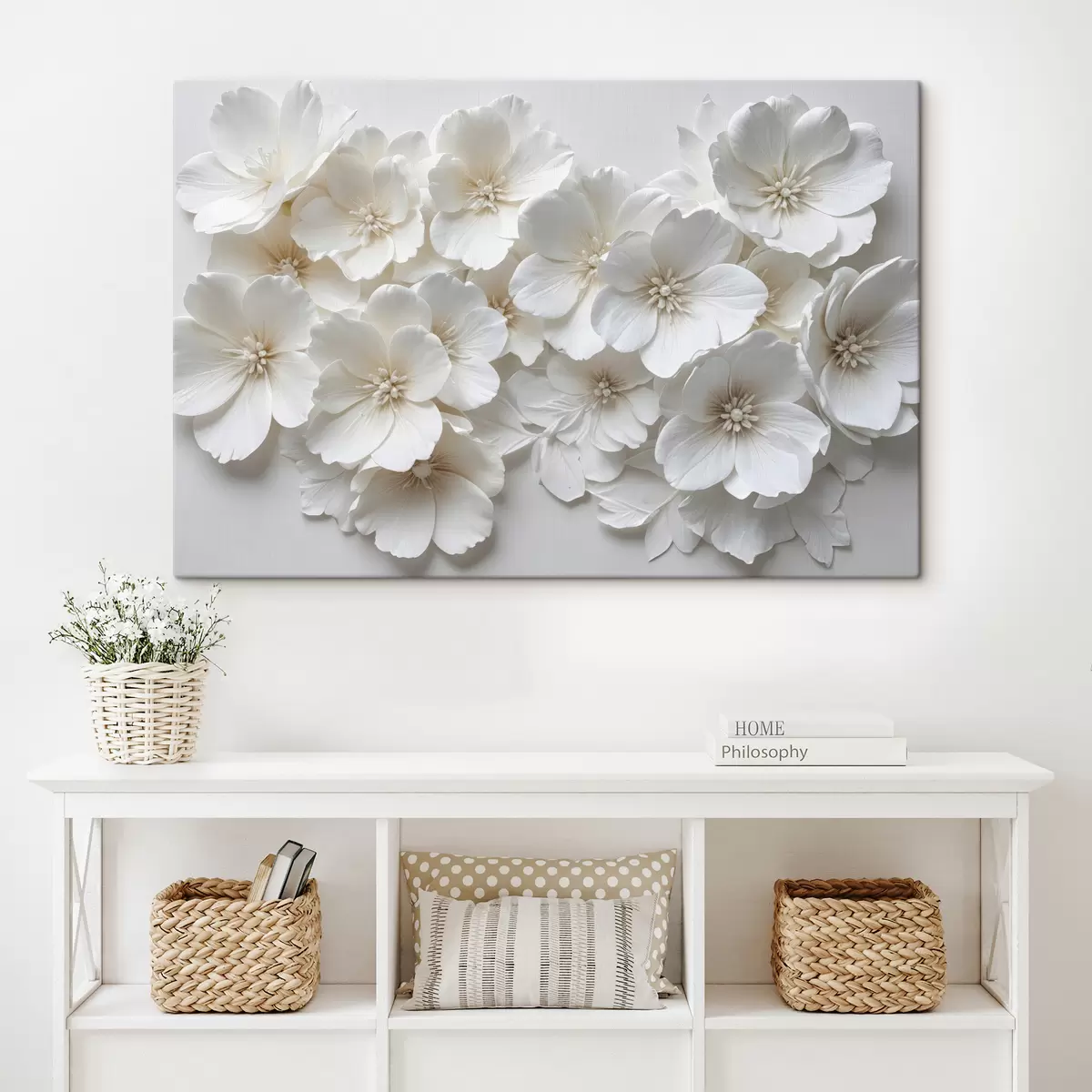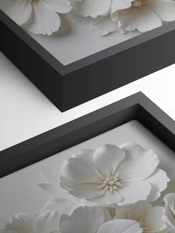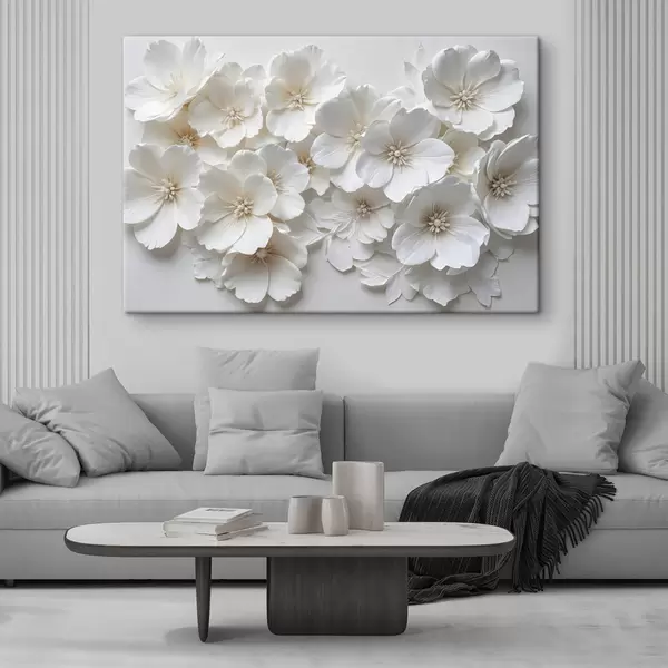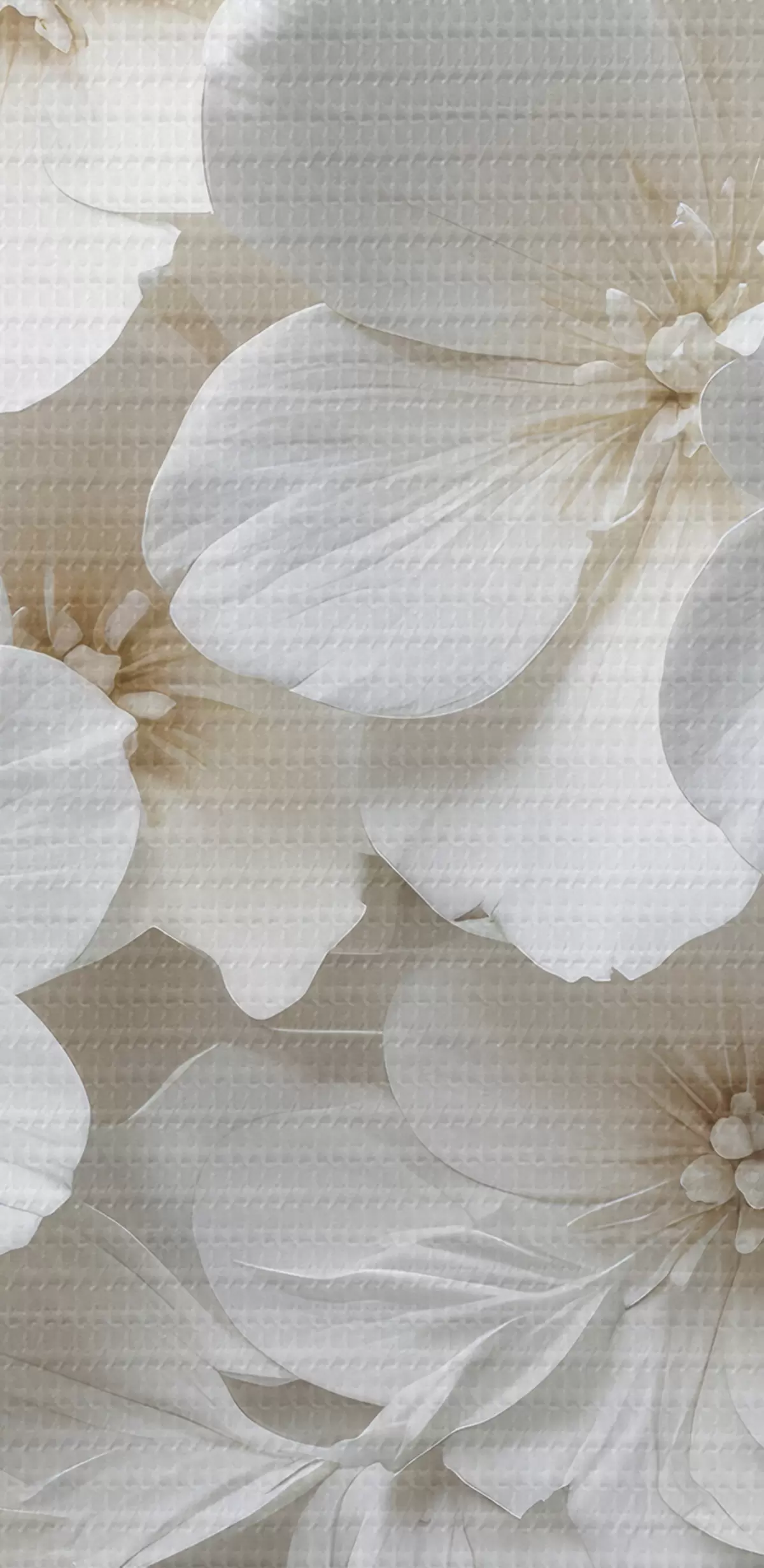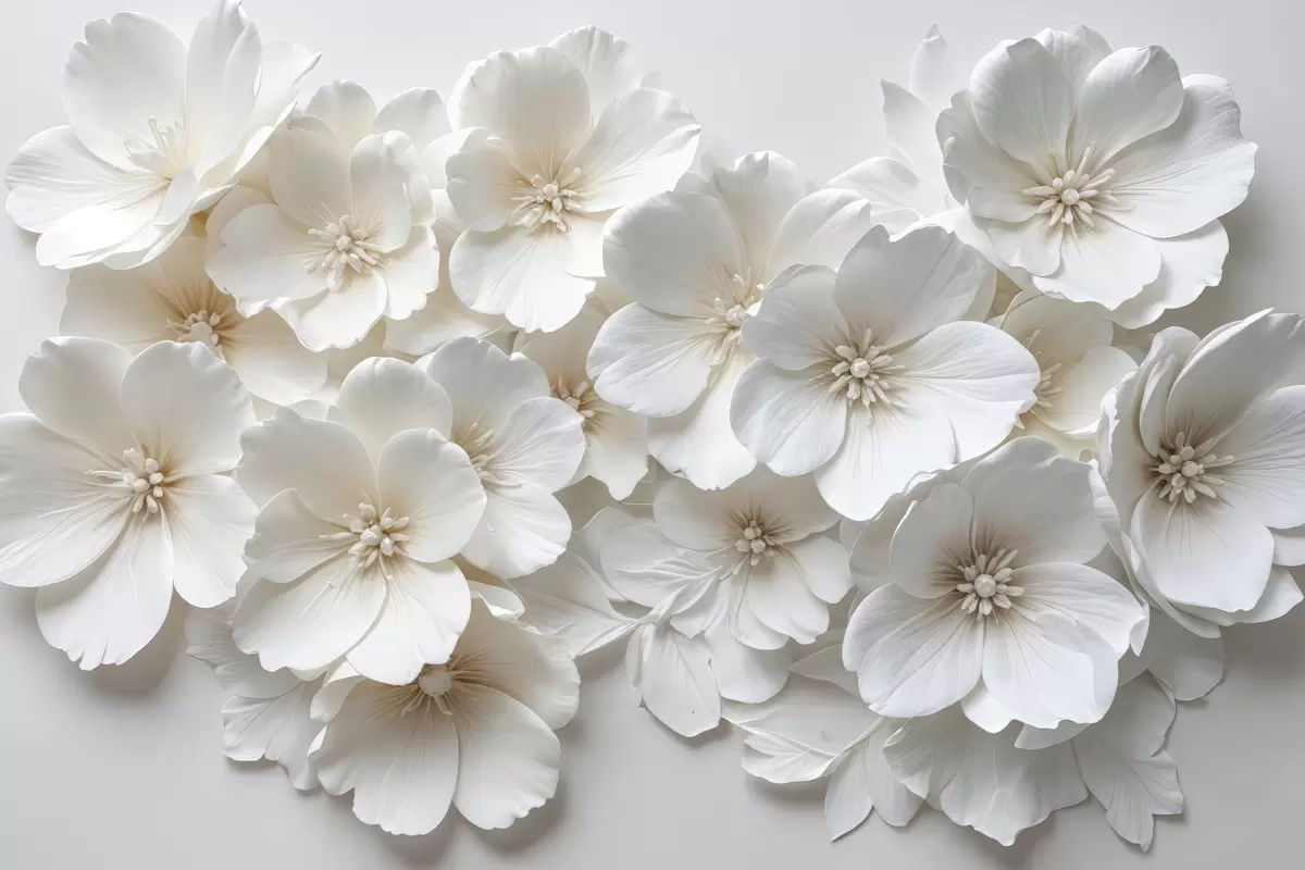 Maalid Valged lilled õrnade kroonlehtedega, mis on paigutatud kauni lillemustriga heledal taustal Nr s40548