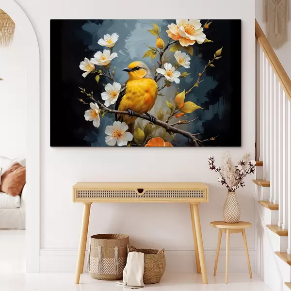 Maalid Oksal istub kollane lind, taustal valged ja oranžid õied Nr s40550