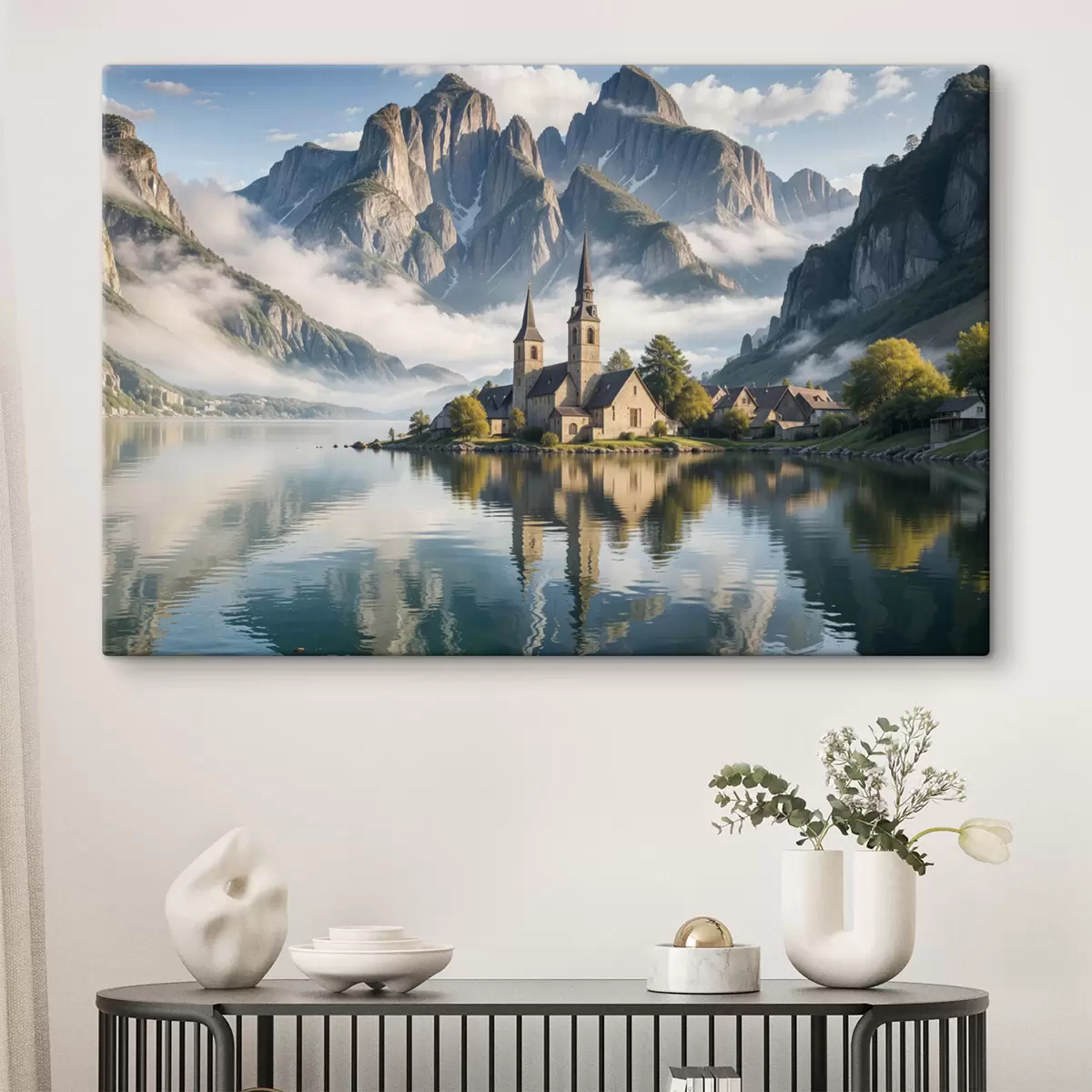 Maalid Maaliline alpiküla, mis asub rahuliku järve ääres kõrguvate lumiste mägedega Nr s40554