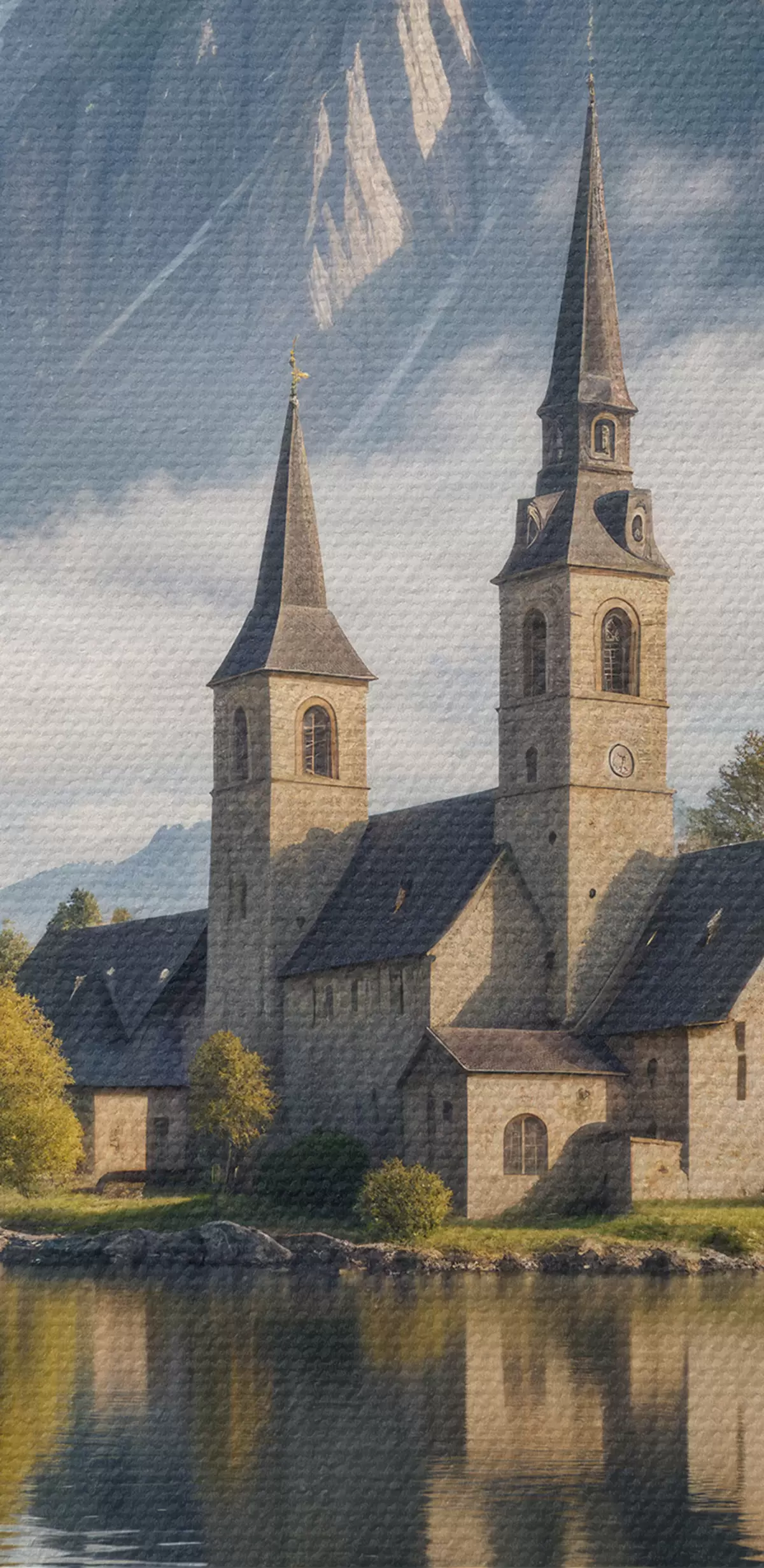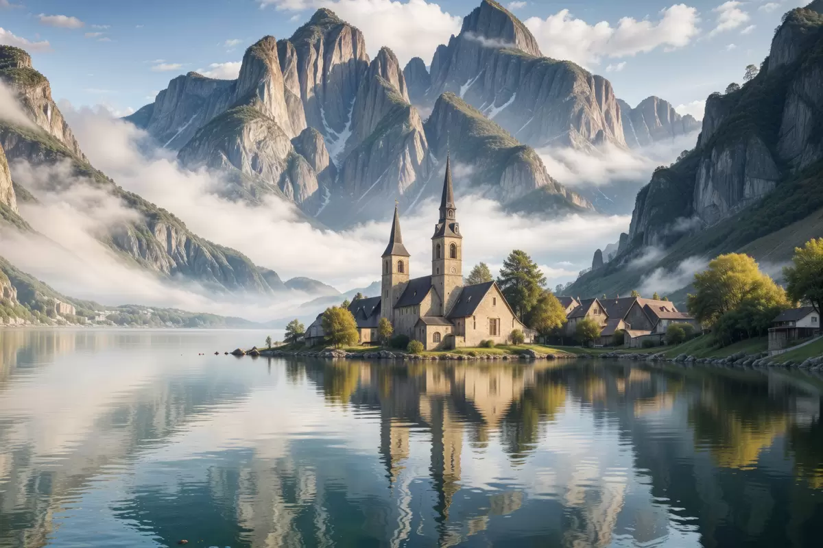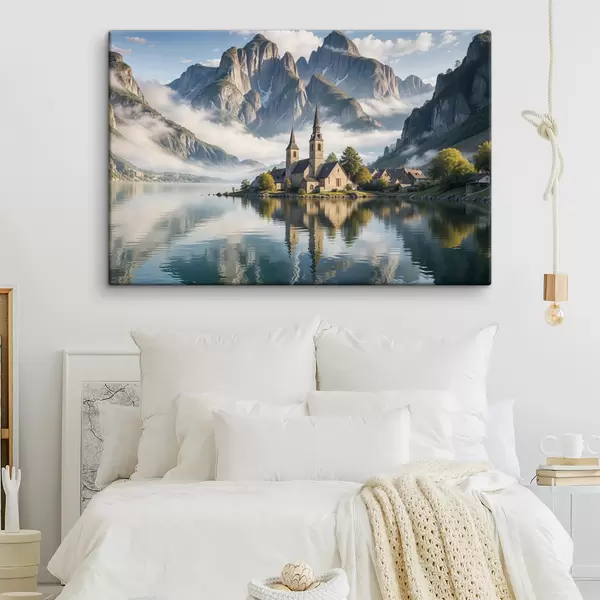 Pilt Maaliline alpiküla, mis asub rahuliku järve ääres kõrguvate lumiste mägedega  s40554