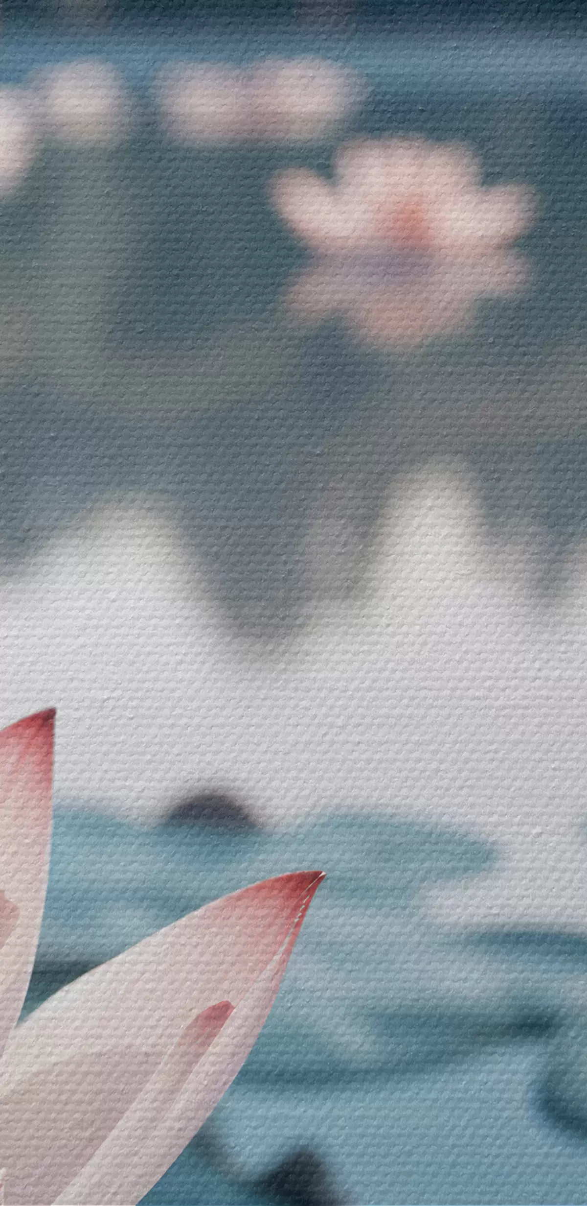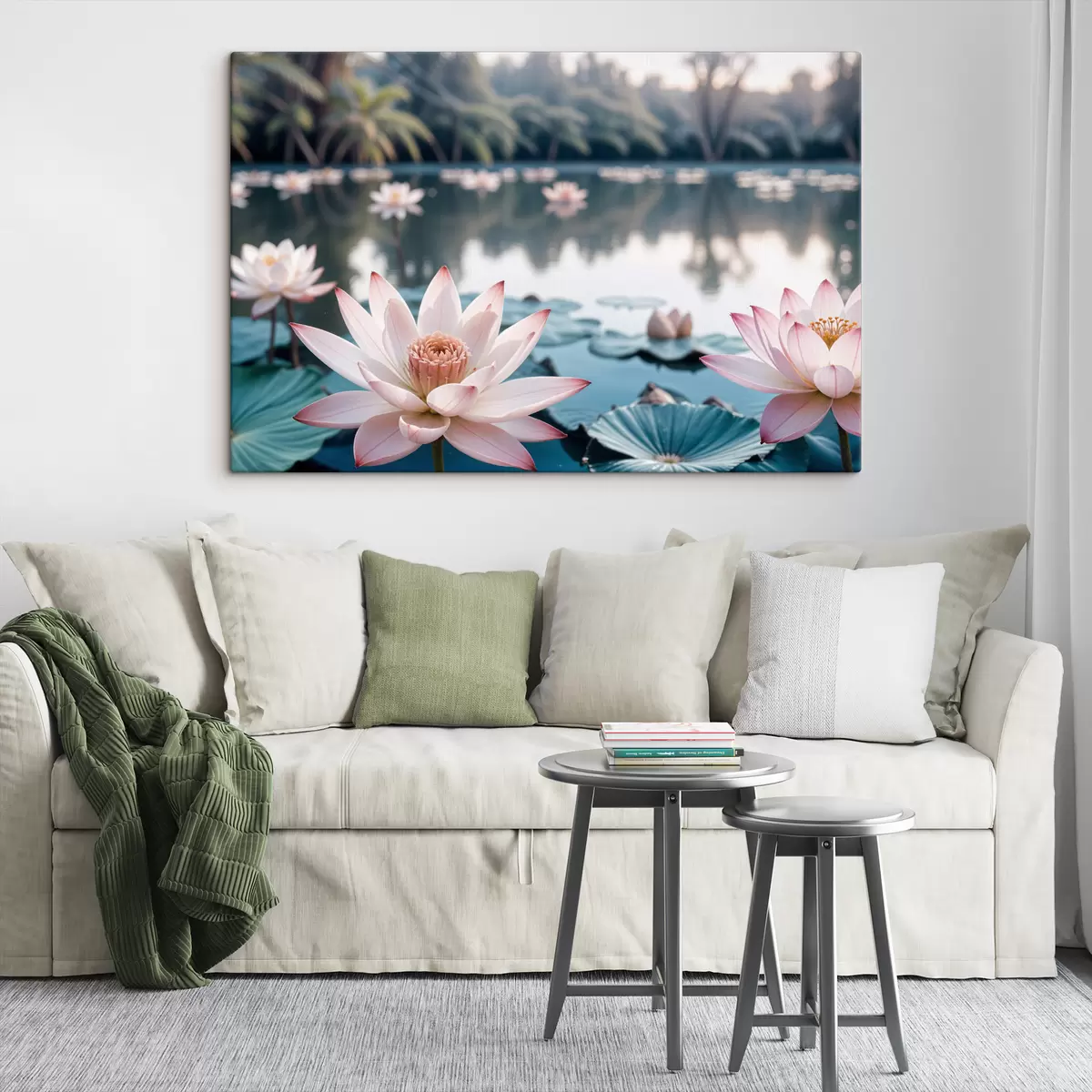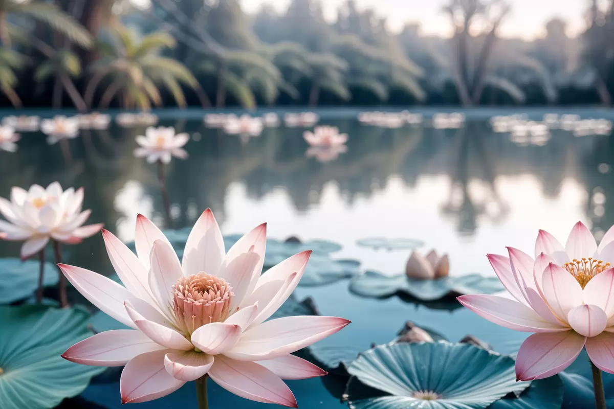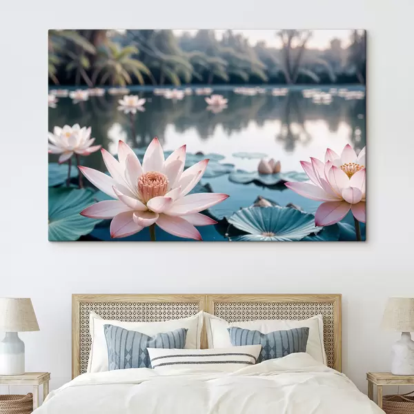 Maalid Pinnal hõljuv roosade lootoseõitega tiik, mida ümbritseb lopsakas rohelus ja palmipuud Nr s40555