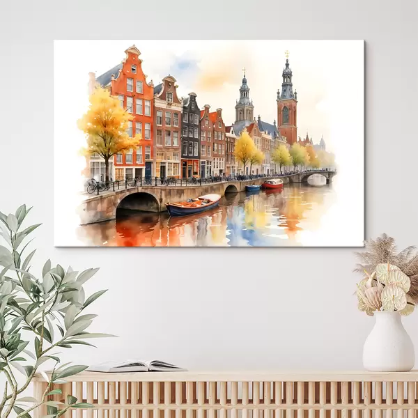 Maalid Amsterdami värvikas akvarelllinnapilt traditsiooniliste Hollandi kanalimajade ja vee peal olevate paatidega Nr s40561