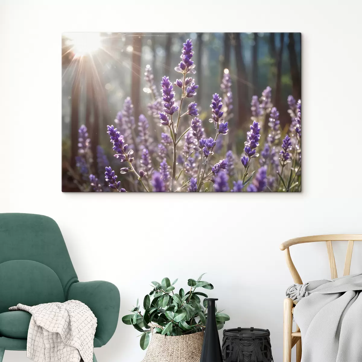 Maalid Lillad lavendliõied põllul, hägune metsataust ja läbi filtreeruv päikesevalgus Nr s40570