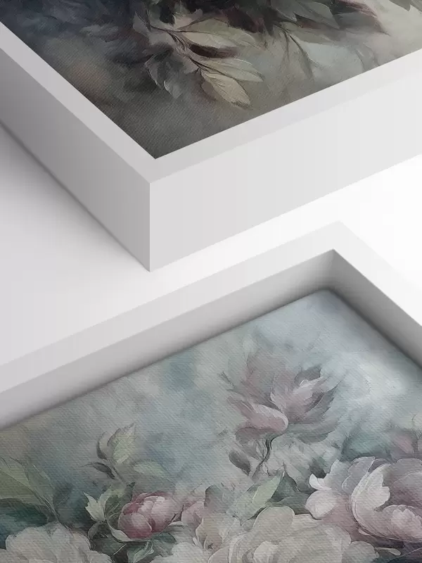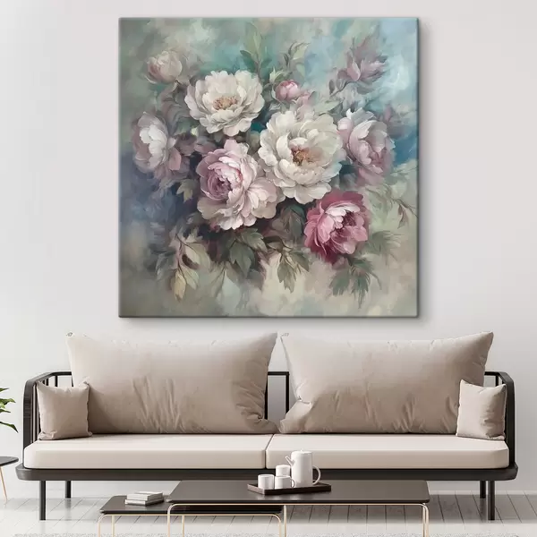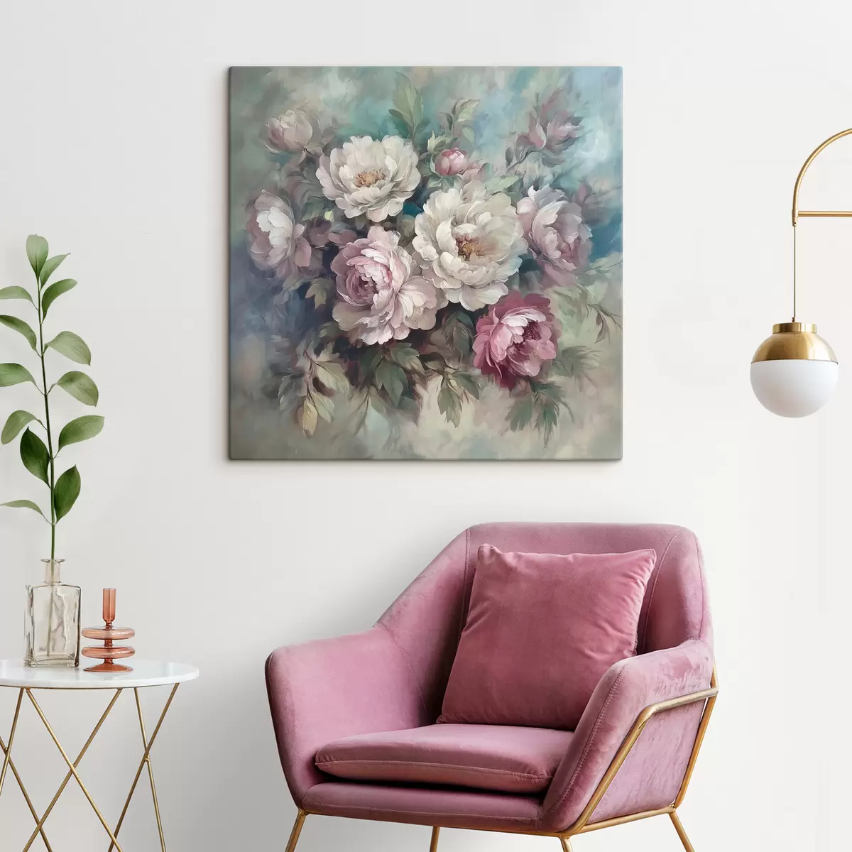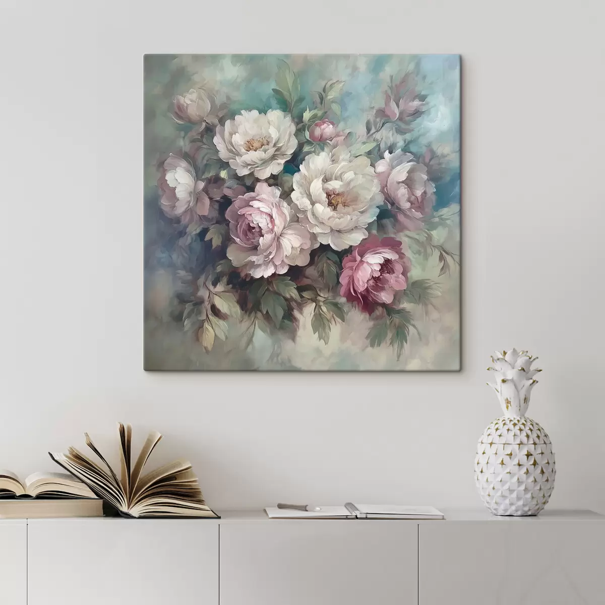 Maalid Roosade ja valgete pojengide kimp õlimaalil Nr s40582