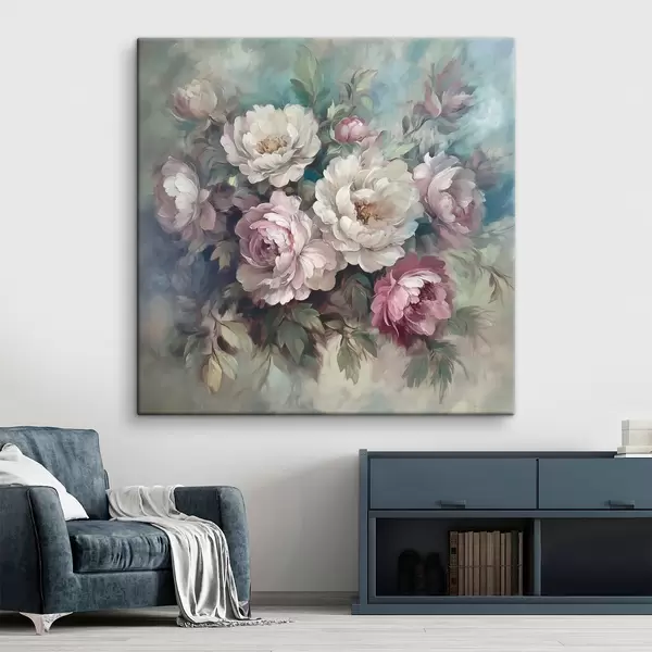 Maalid Roosade ja valgete pojengide kimp õlimaalil Nr s40582