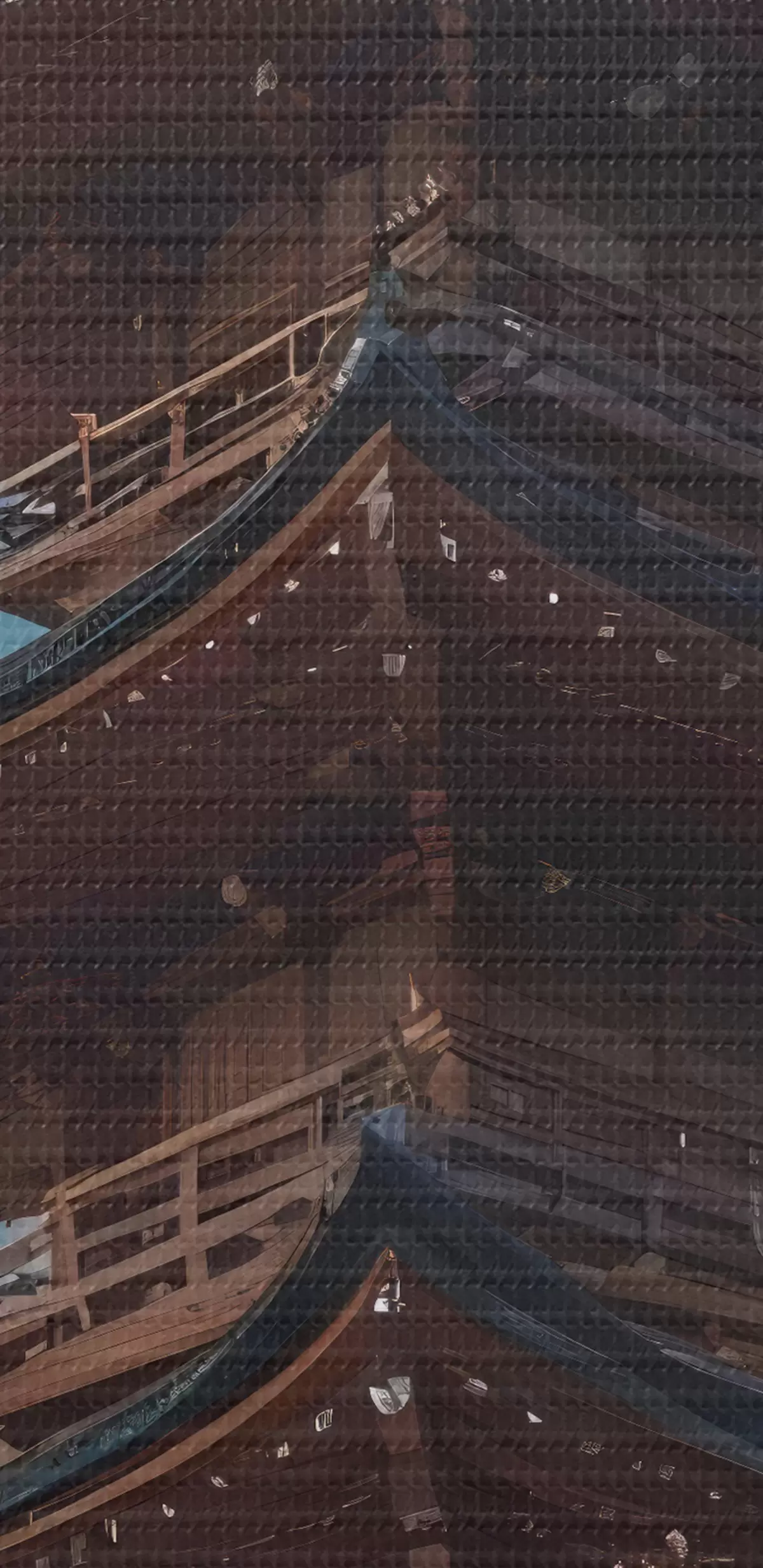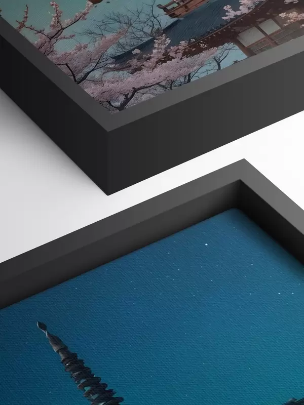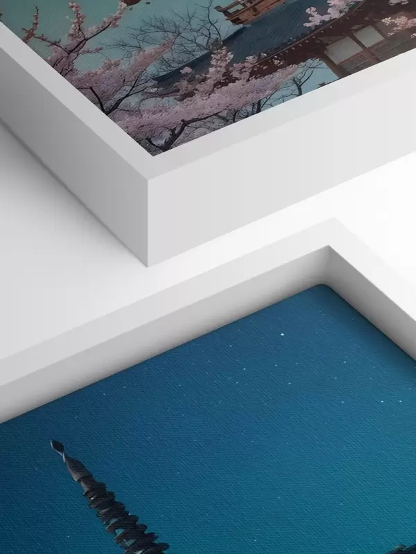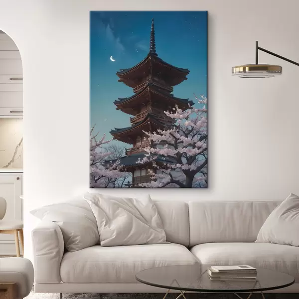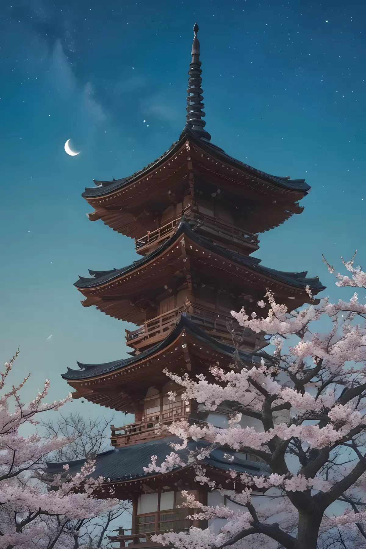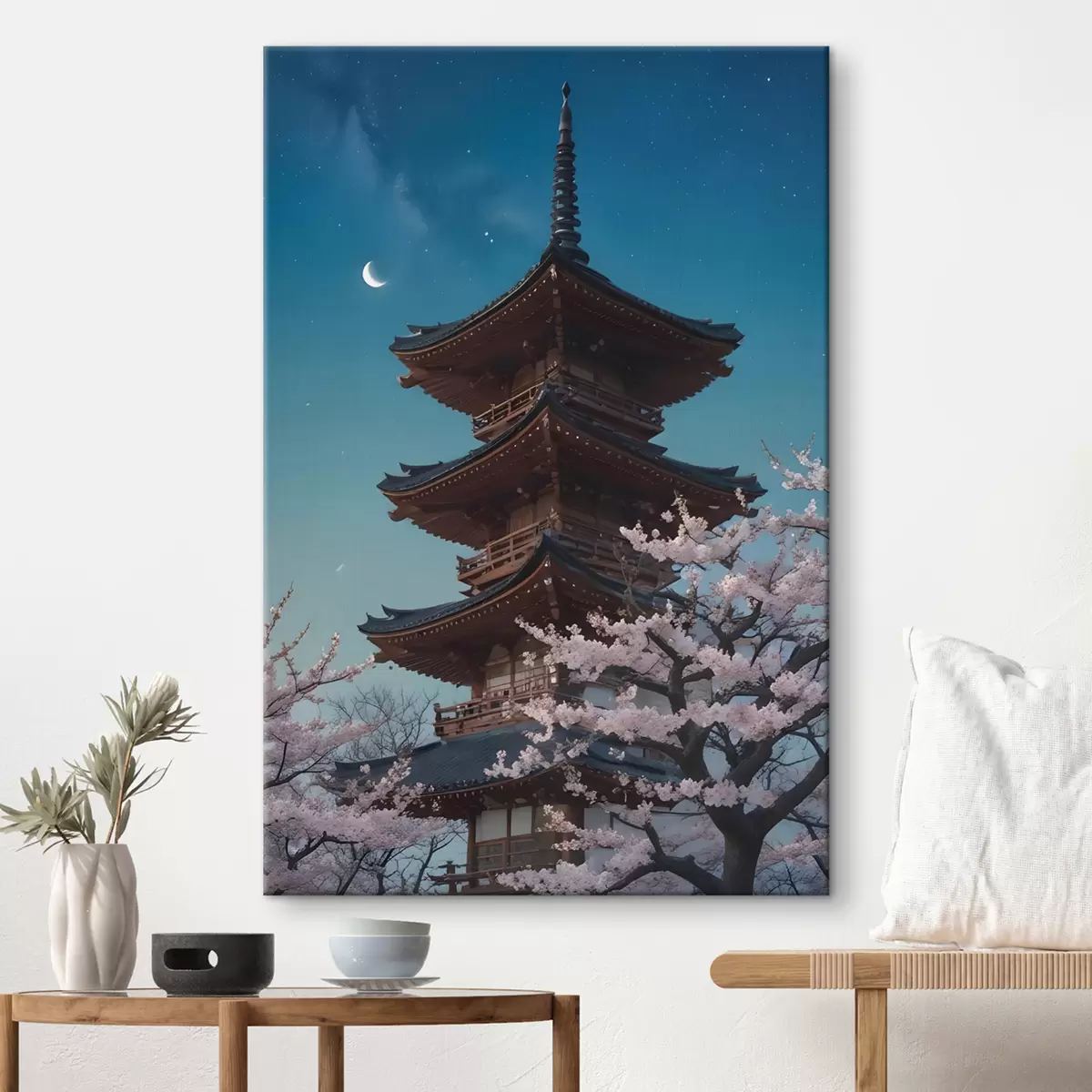 Maalid Traditsiooniline Jaapani pagood, mille taevas on poolkuu ja õitsevad kirsiõiepuud Nr s40586
