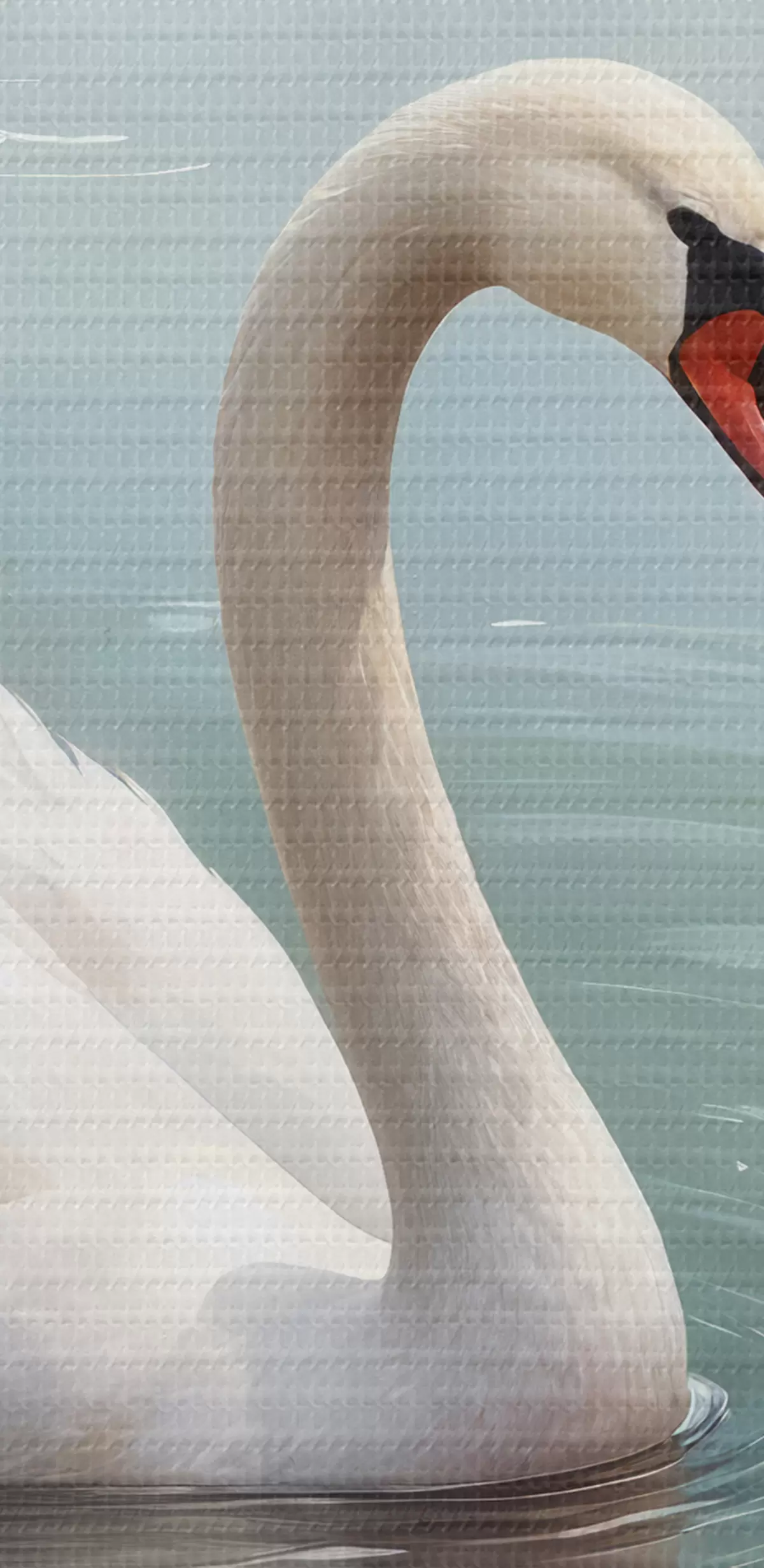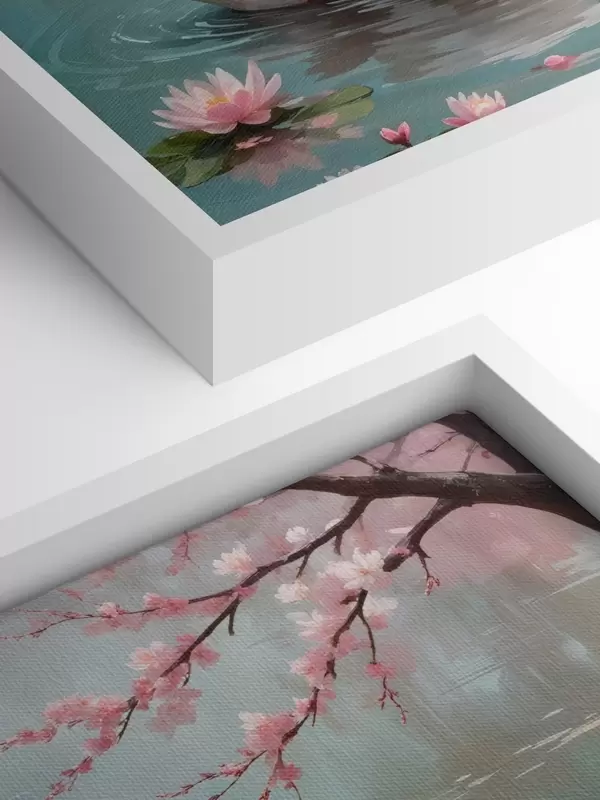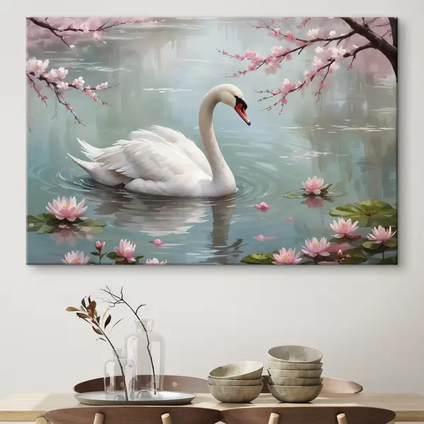 Maalid Graatsiline valge luik ujub rahulikus tiigis, mida ümbritsevad õitsvad roosad kirsiõiepuud Nr s40597