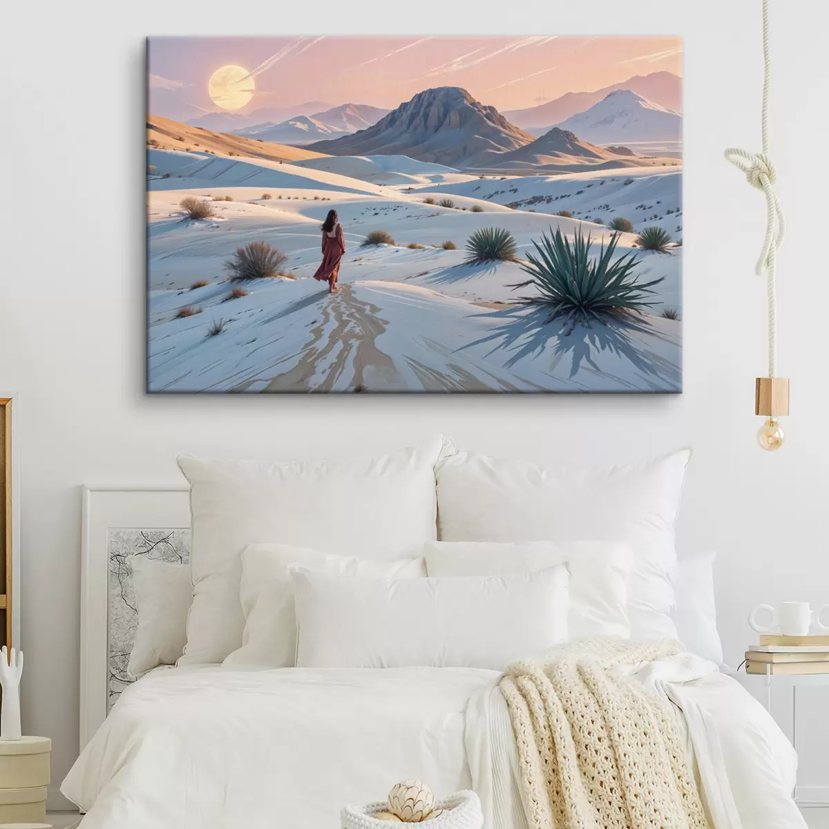 Maalid Punases kleidis naine kõrbemaastikul, taustal mägi ja liivaluited Nr s40603
