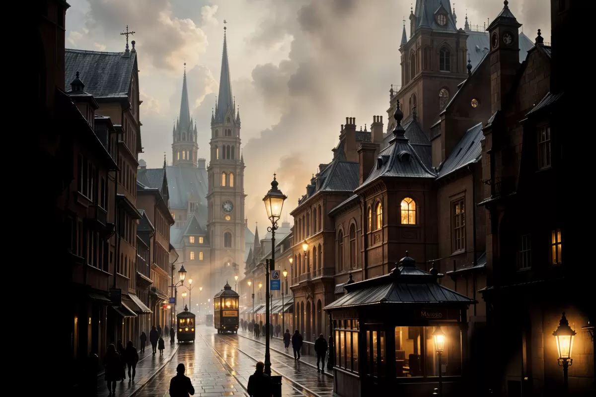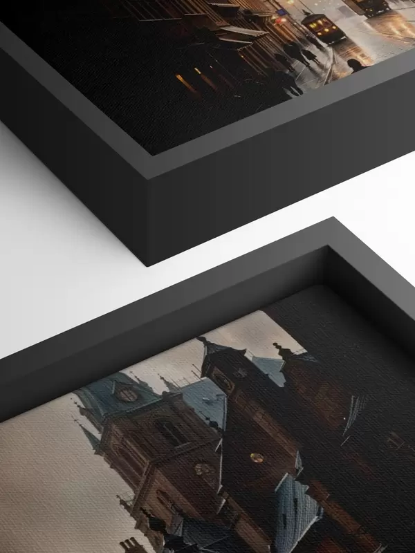 Maalid Vihmane õhtu ühes vanas Euroopa linnas, kus on munakivist tänavad, ajaloolised hooned ja mööda sõidab tramm Nr s40604