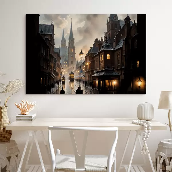 Maalid Vihmane õhtu ühes vanas Euroopa linnas, kus on munakivist tänavad, ajaloolised hooned ja mööda sõidab tramm Nr s40604