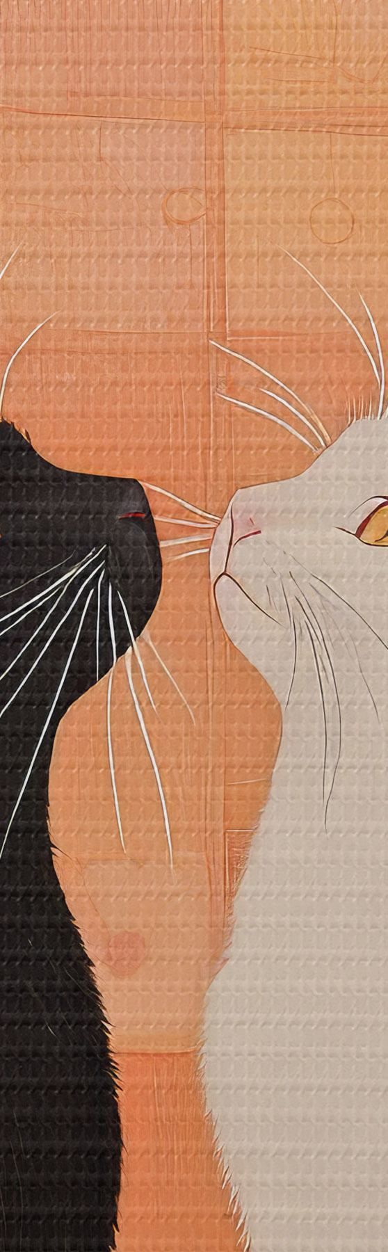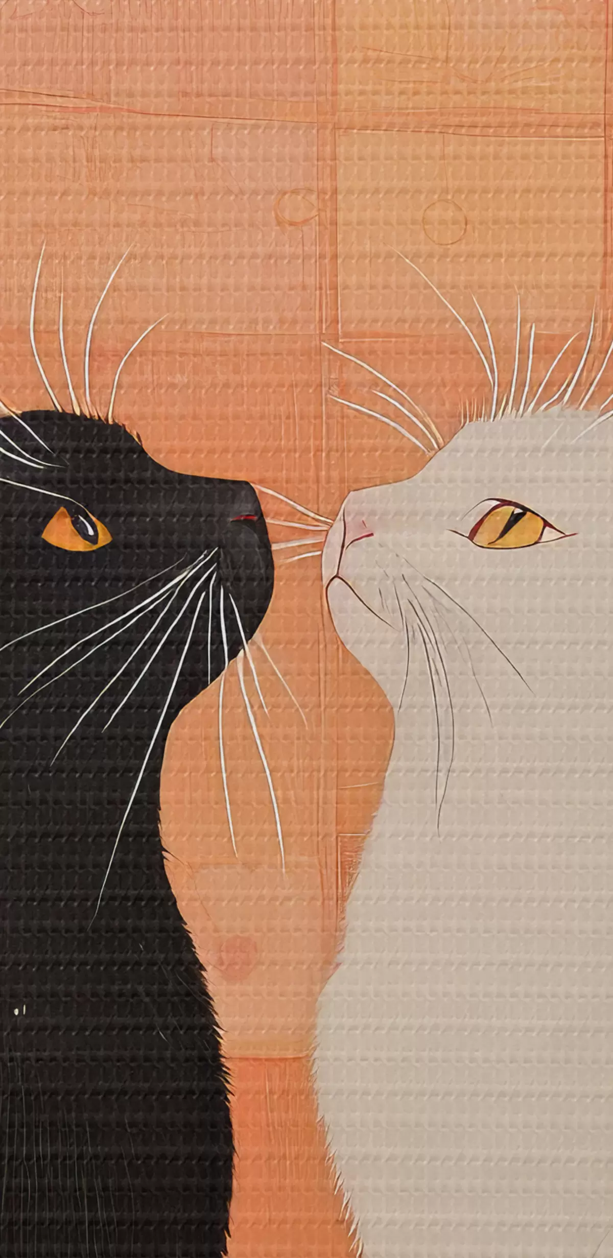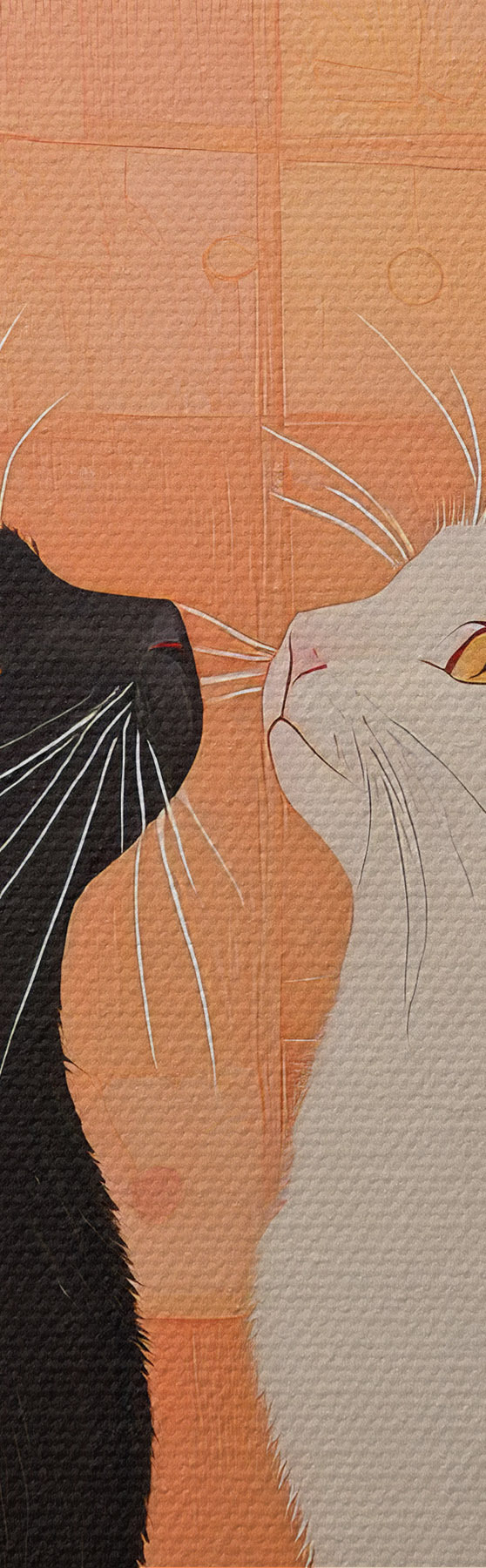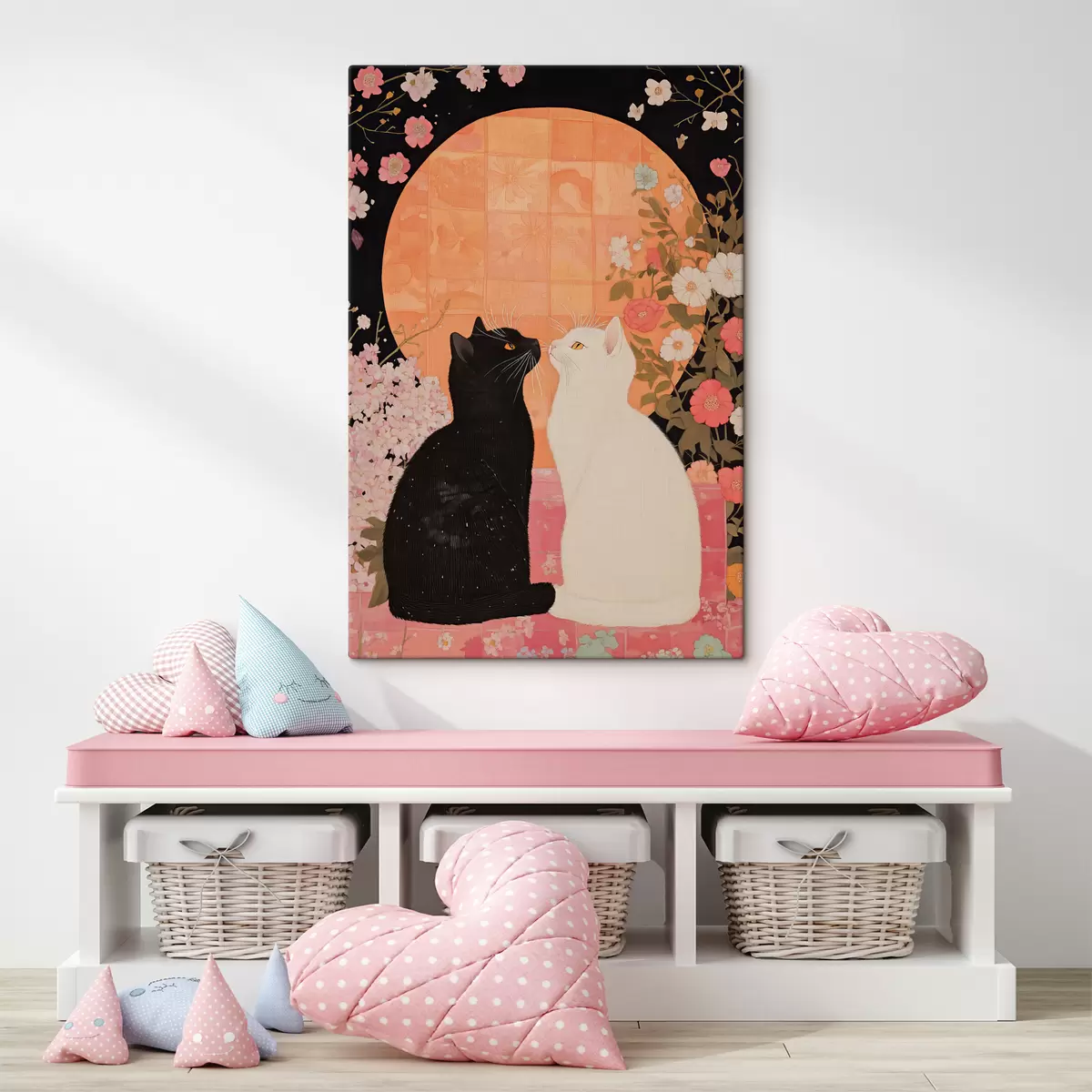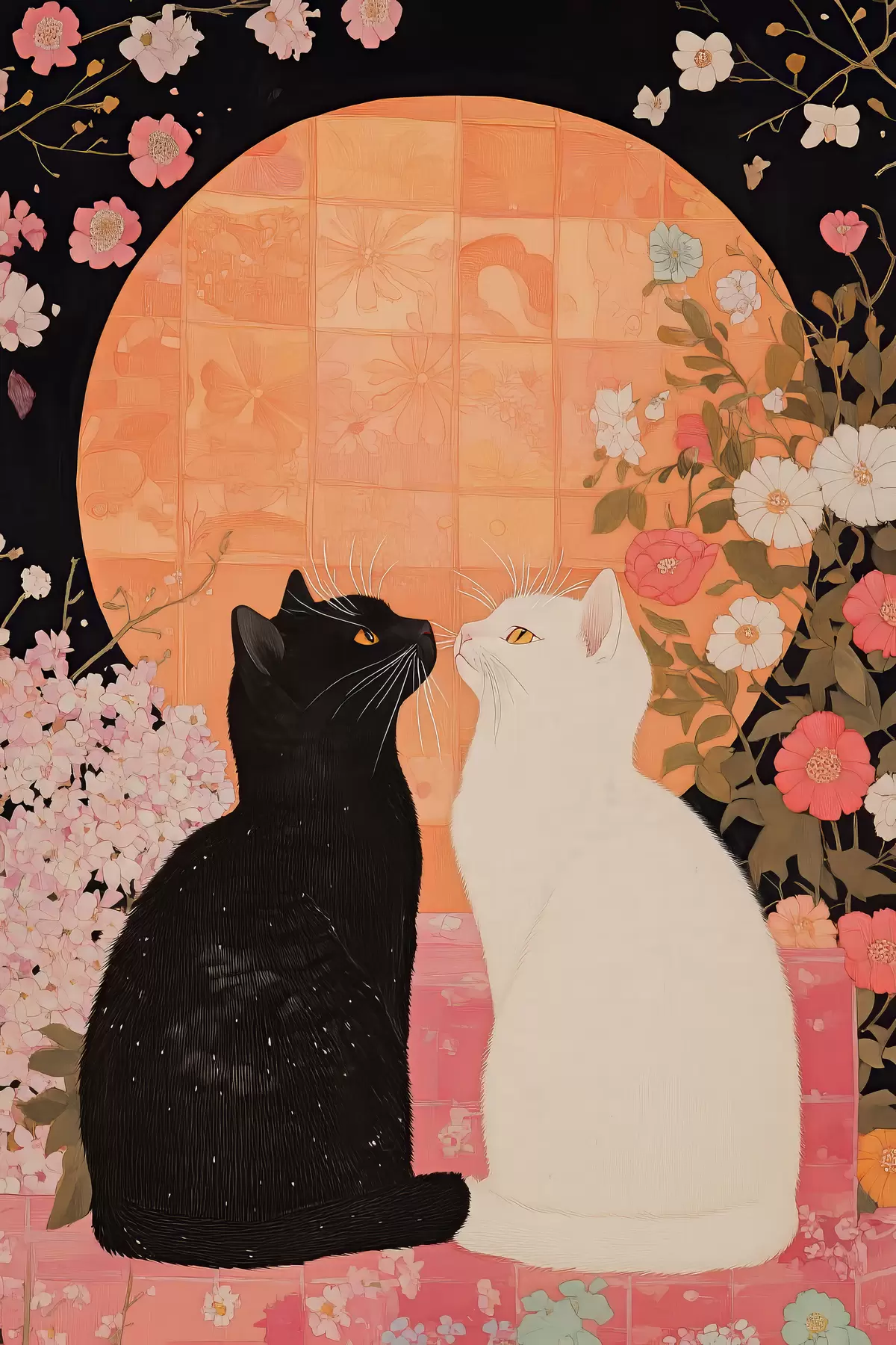 Maalid Must ja valge kass vaatavad üksteisele armsalt otsa päikeseloojangul Nr s40669