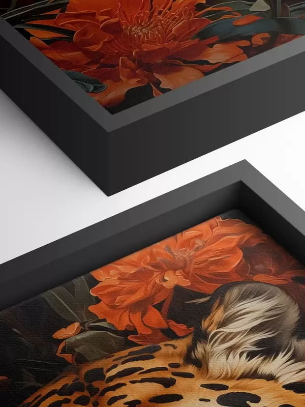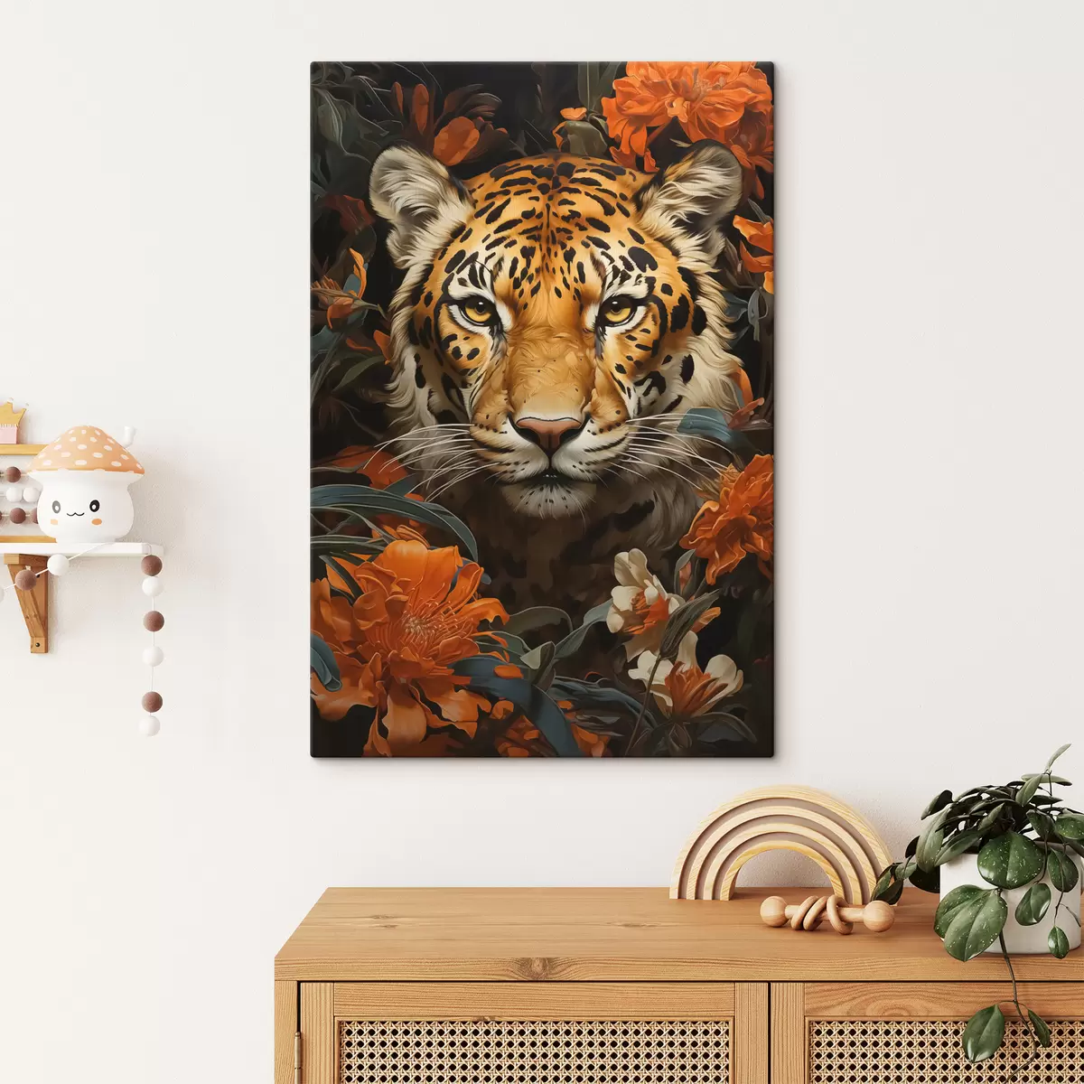 Maalid Tiigri portree, mida ümbritsevad troopilised lilled Nr s40757