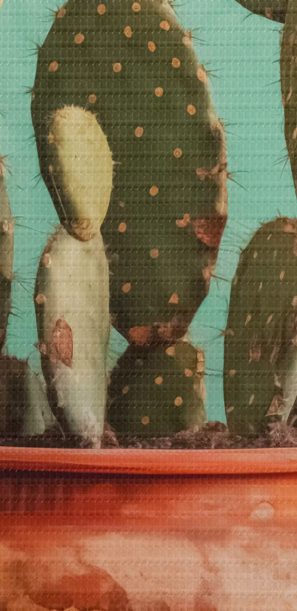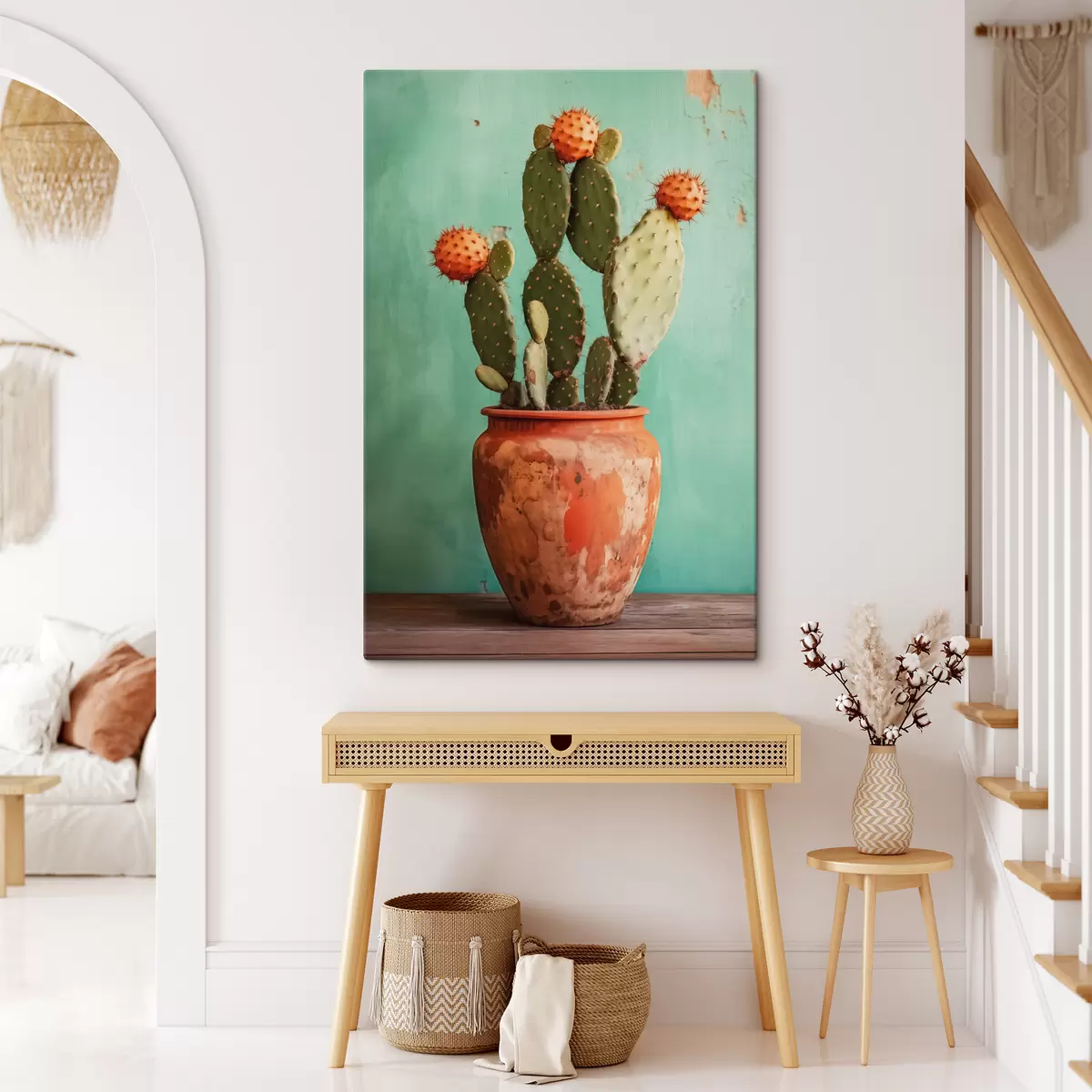 Maalid Kaktus vanas savipotis sinirohelise seina taustal Nr s40807