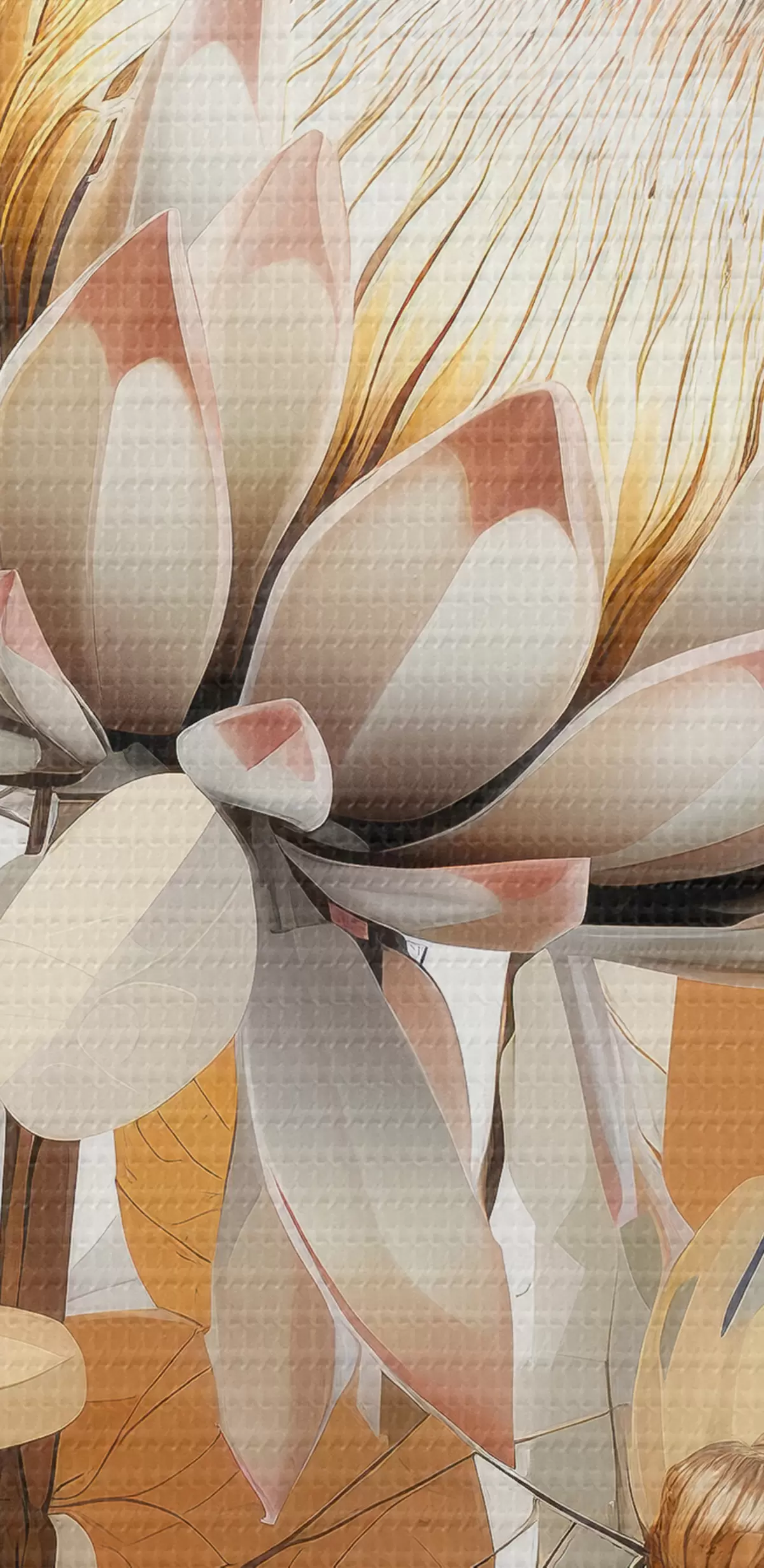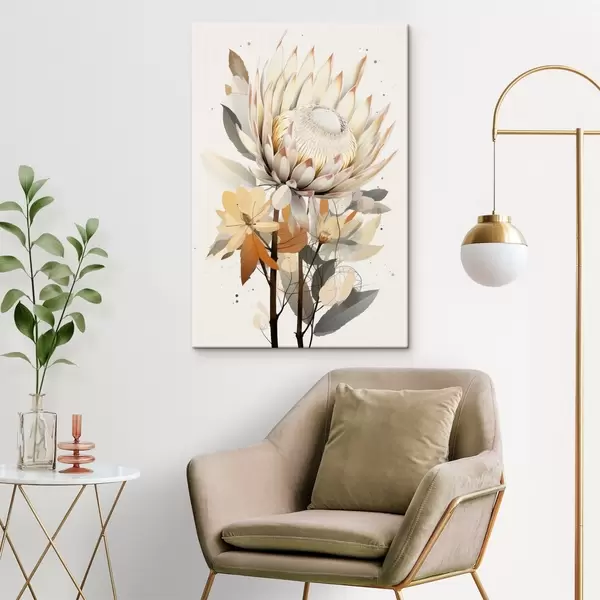 Maalid Ilusad protea lilled koos lopsakate lehtedega, pehmed beežid värvid, puuvillane Nr s40817