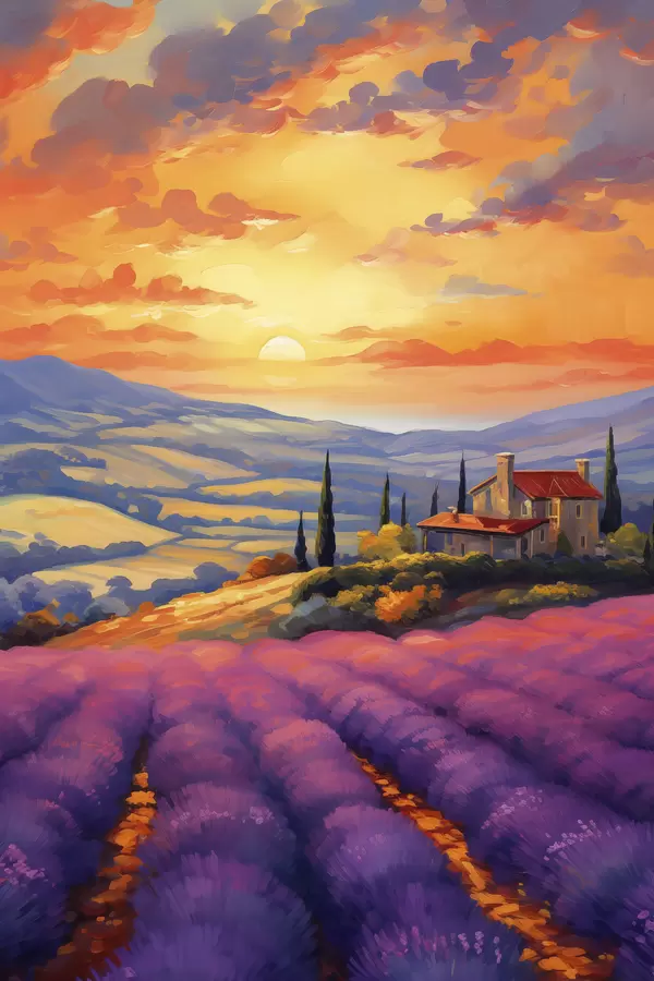 Maalid Toscana päikeseloojang, lavendlipõllud, ilusad maastikud, akvarell Nr s40942