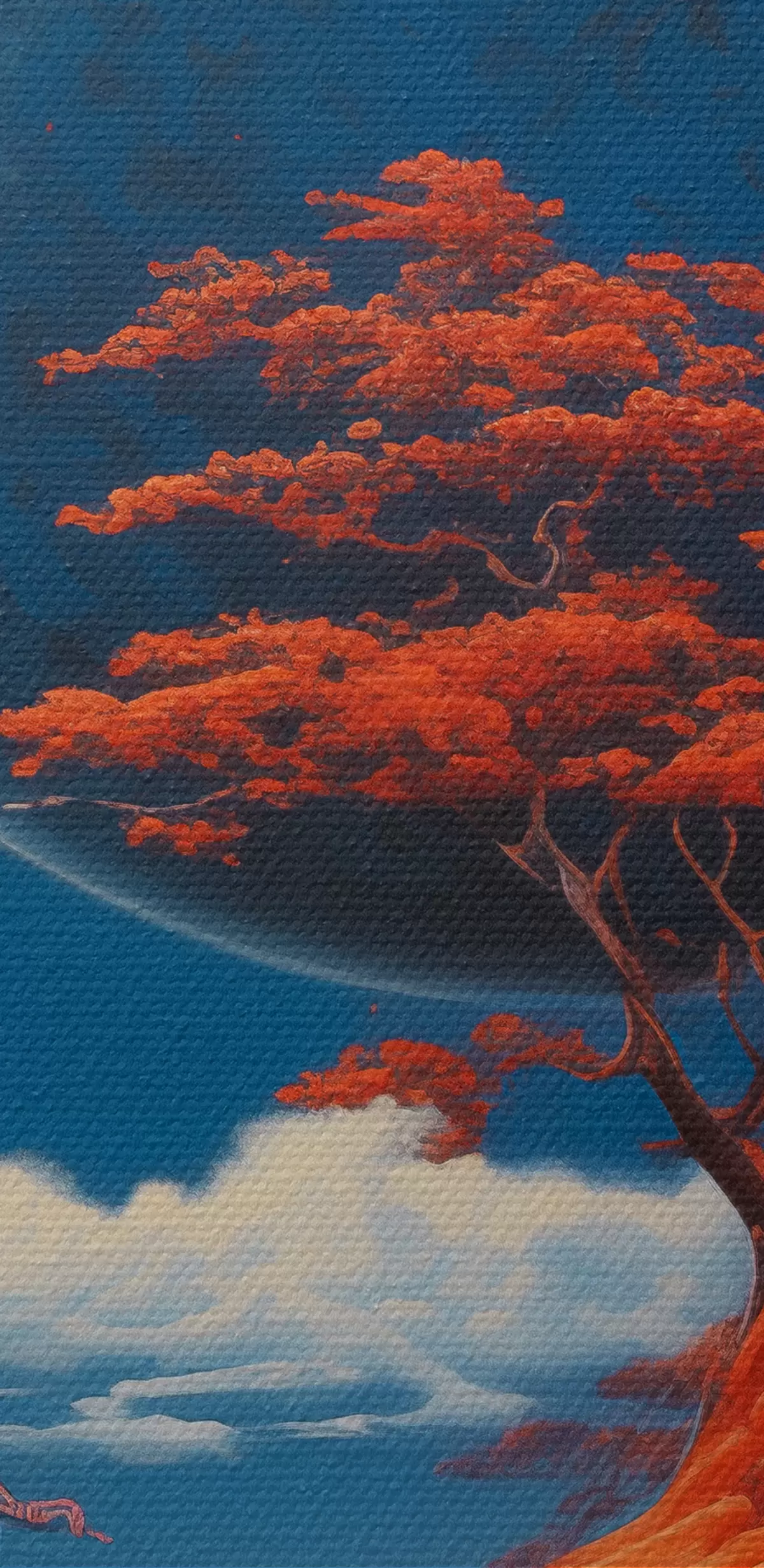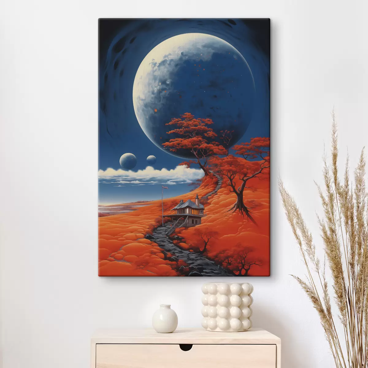 Maalid Kosmiline illustratsioon, planeedid, sinine taevas, maja mäel, puud Nr s40946