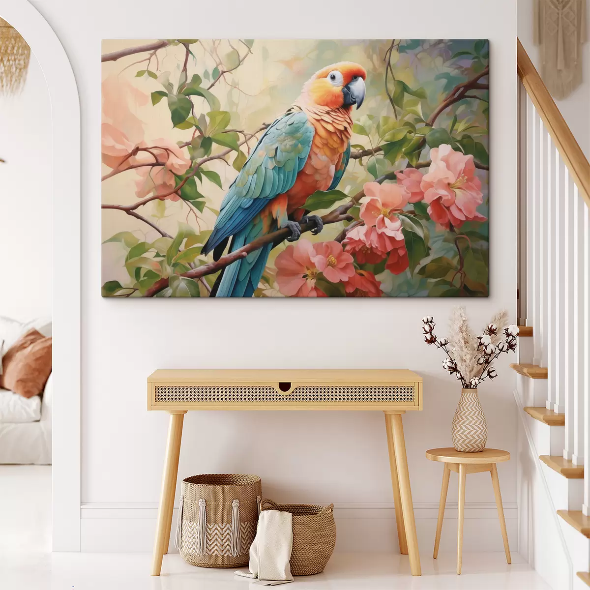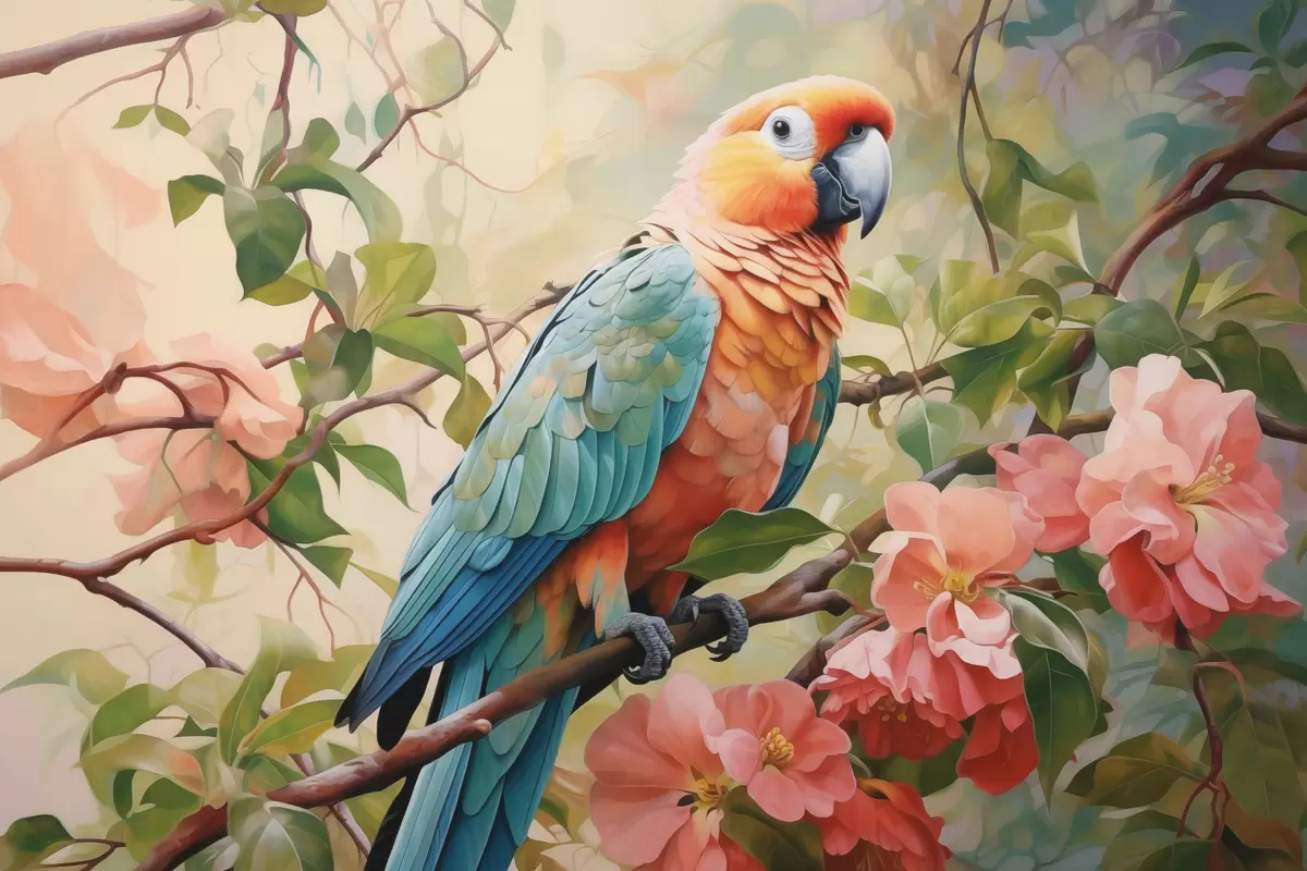 Maalid Papagoi istub roosade lilledega oksal Nr s41018