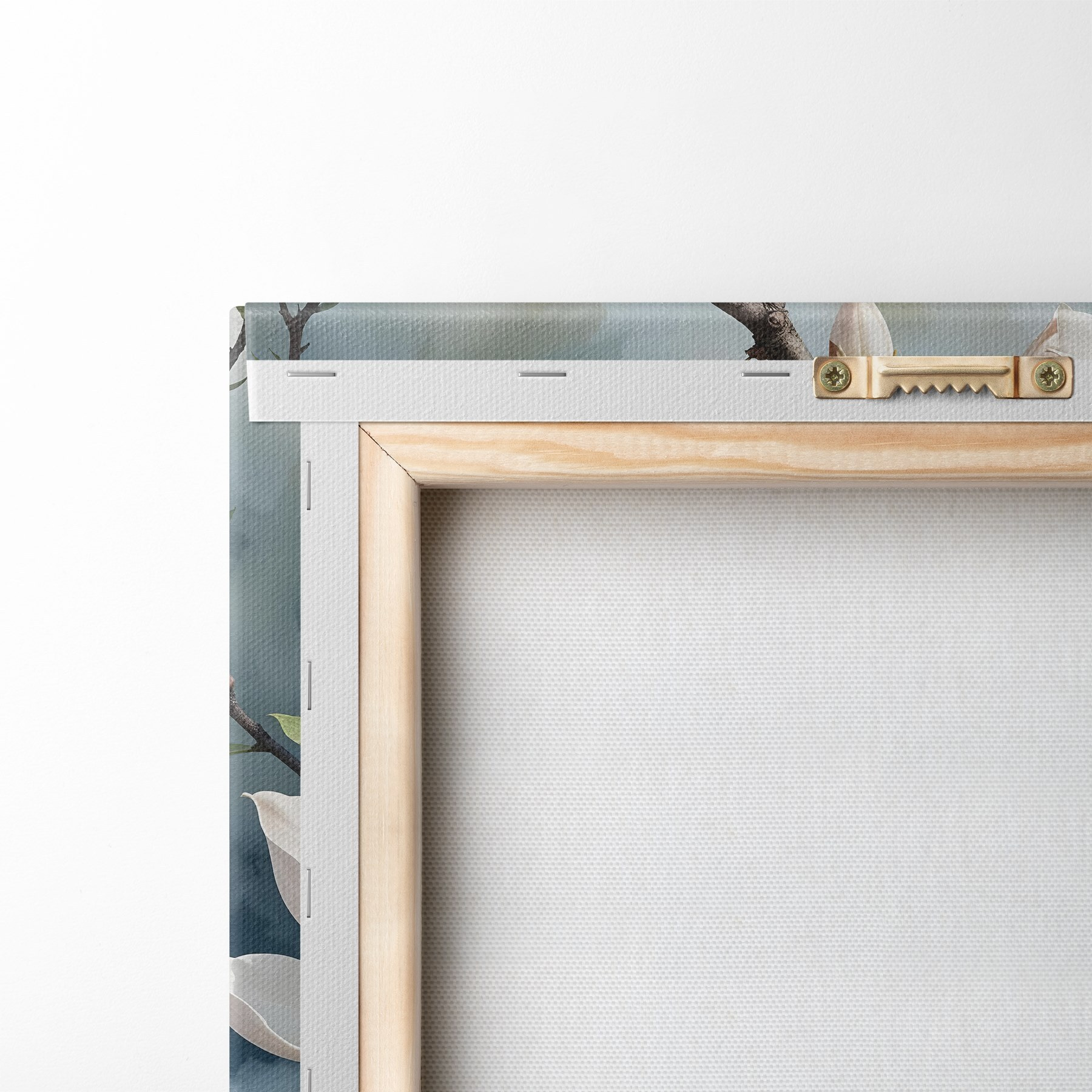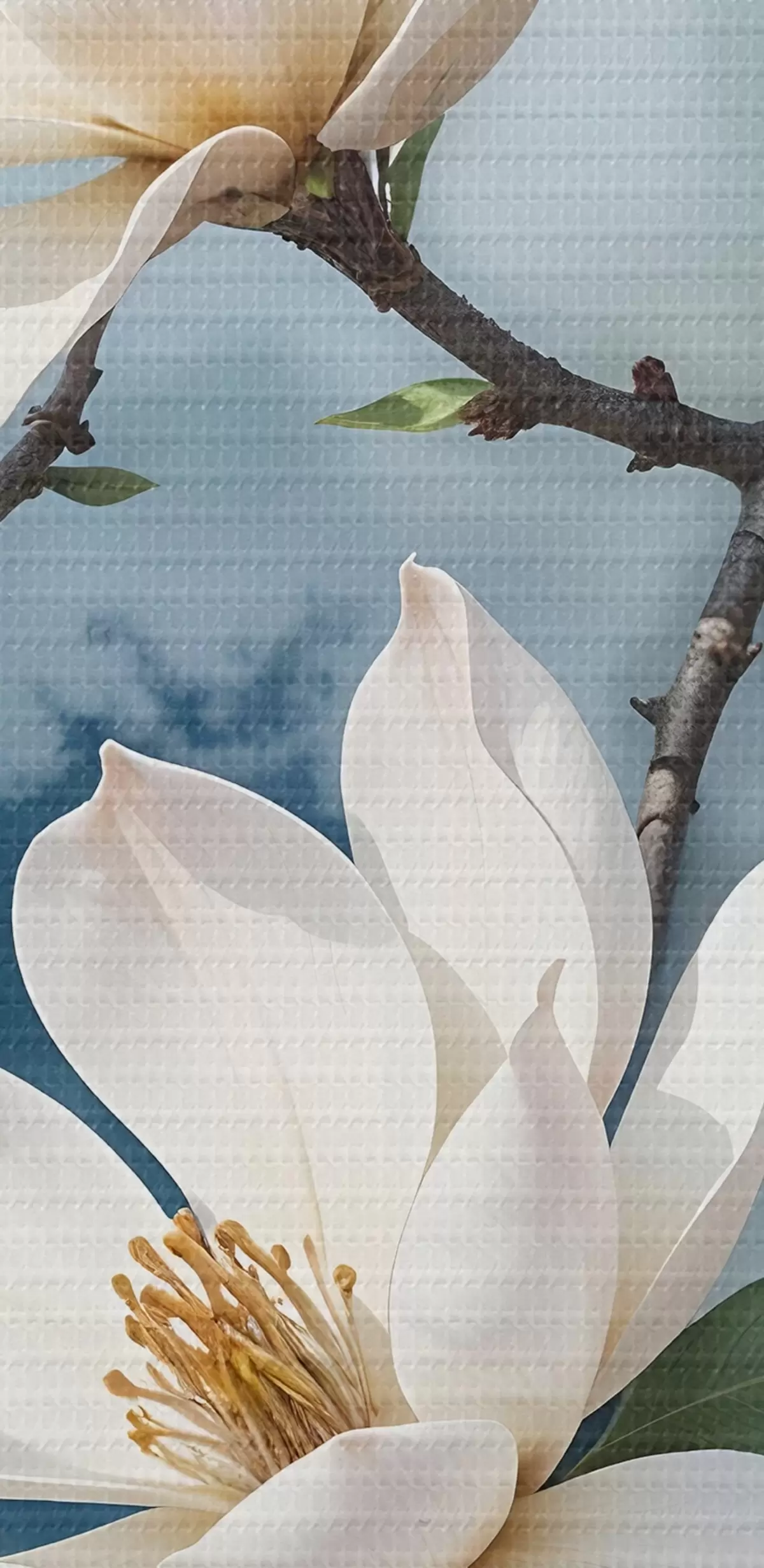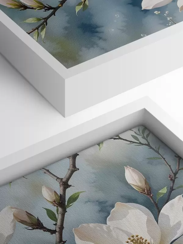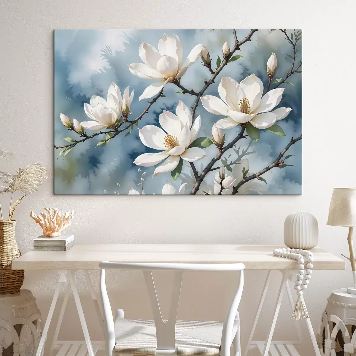 Maalid Valged magnoolia lilled õitsevad puuoksadel pehmel akvarellsinise taeva taustal Nr s41081