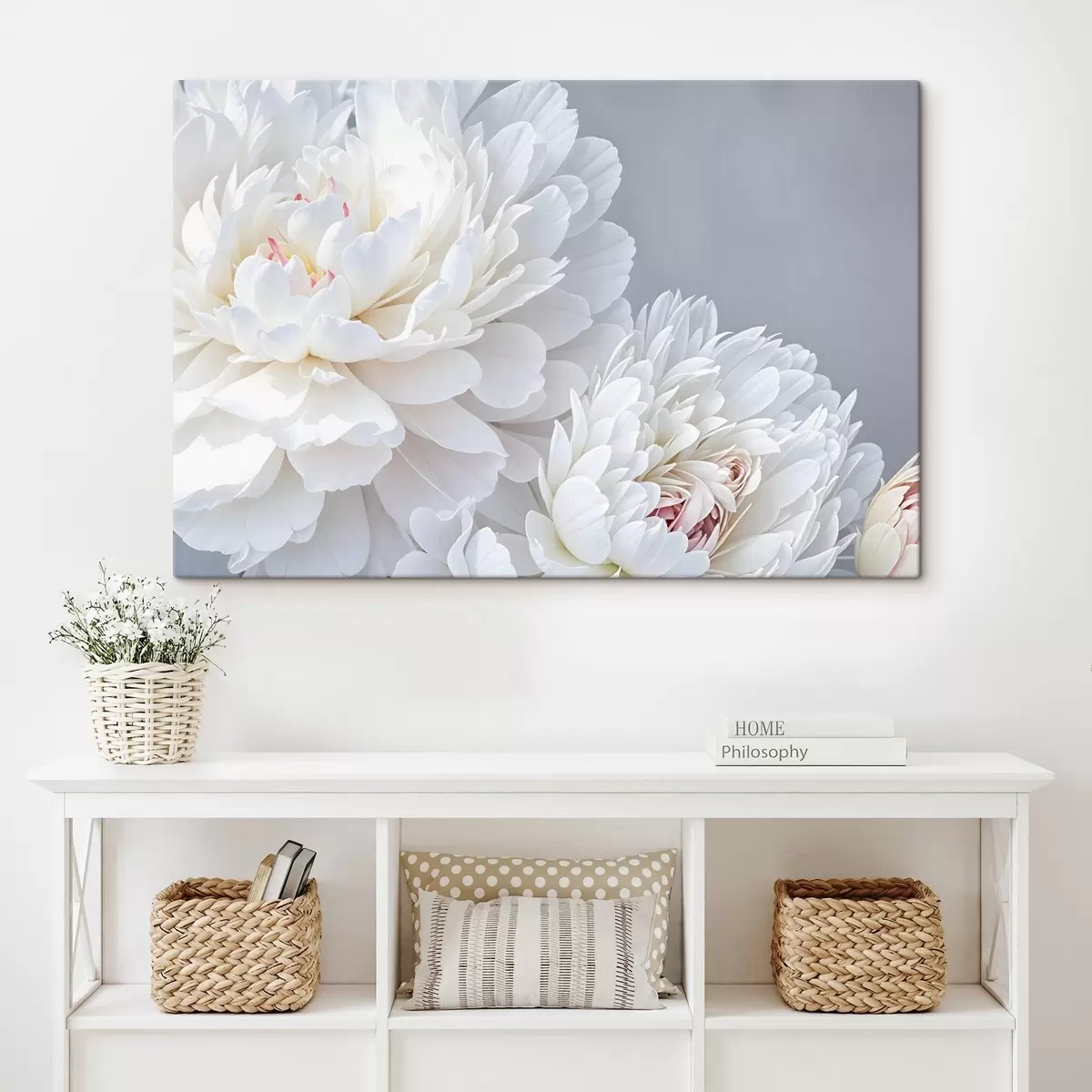 Maalid Valged pehmete, õrnade kroonlehtedega pioonililled helehallil taustal Nr s41085