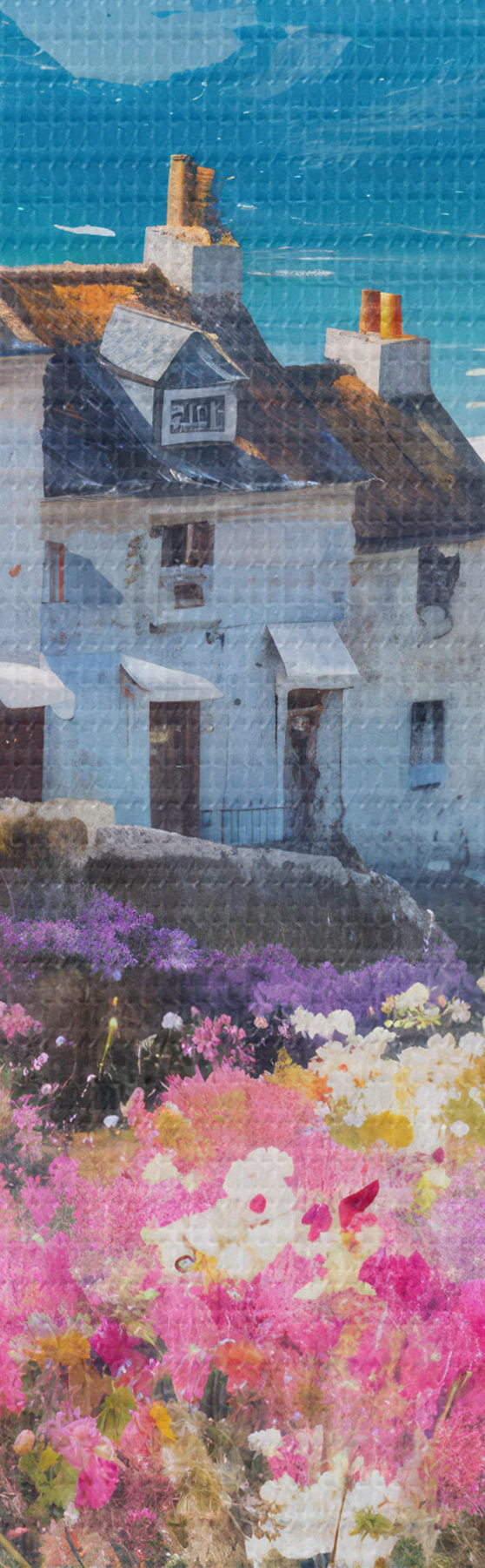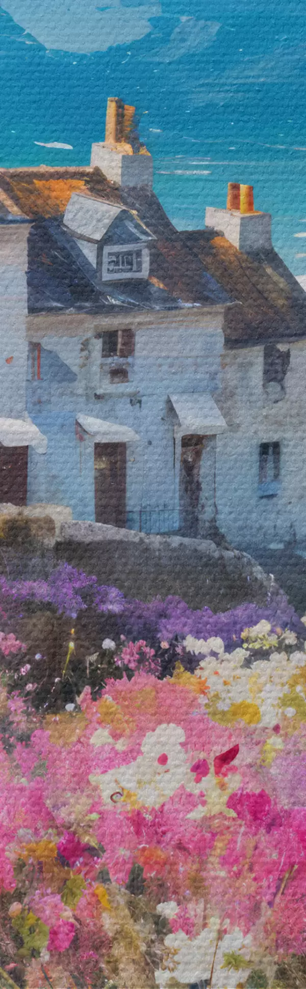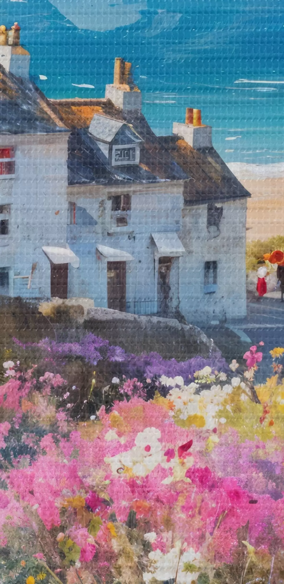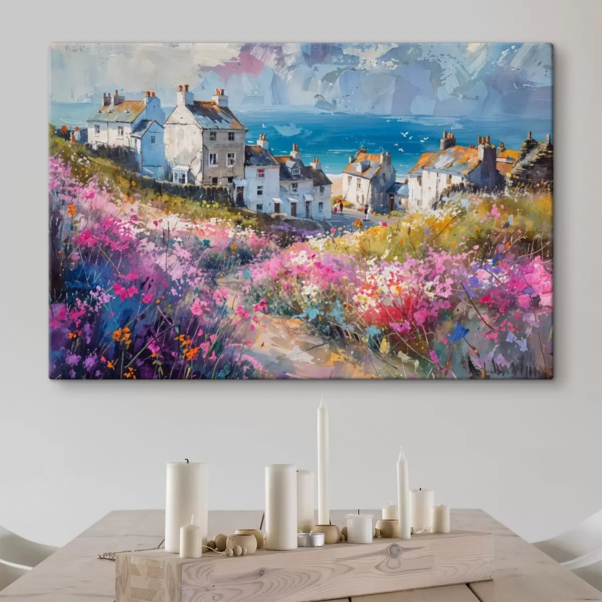Maalid Värviline õlimaal rannikulinna valgete majade ja elava lilleaiaga esiplaanil Nr s41090