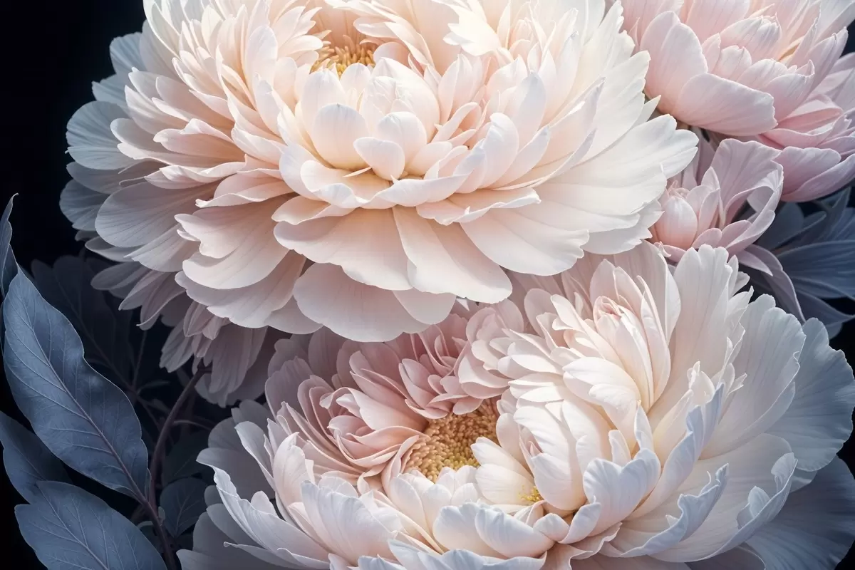 Maalid Õrnad pastellroosad pehmete, kohevate kroonlehtedega ja siniste lehtedega õrnad pioonid tumedal taustal Nr s41092
