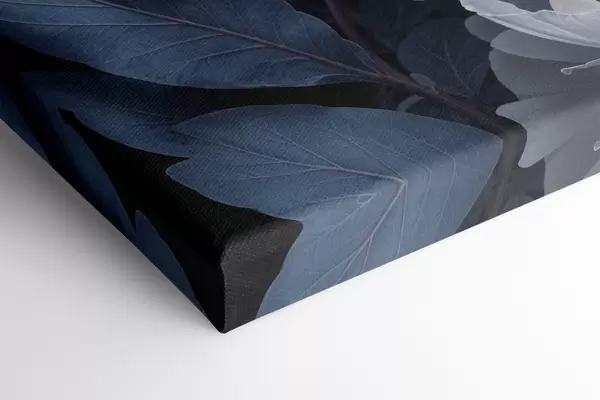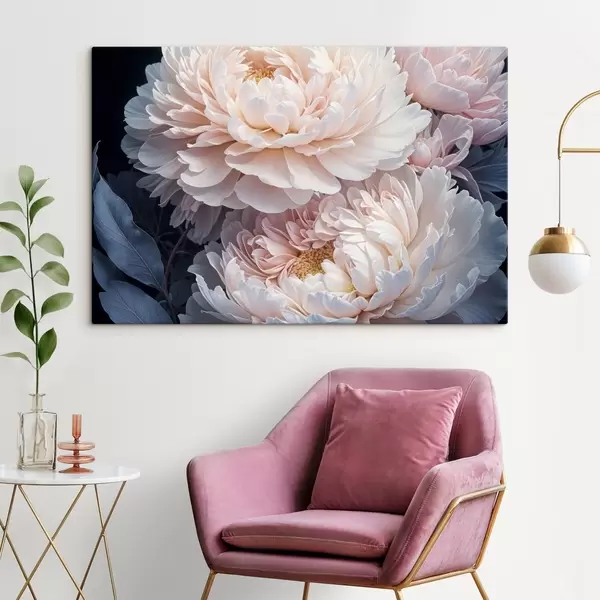 Maalid Õrnad pastellroosad pehmete, kohevate kroonlehtedega ja siniste lehtedega õrnad pioonid tumedal taustal Nr s41092