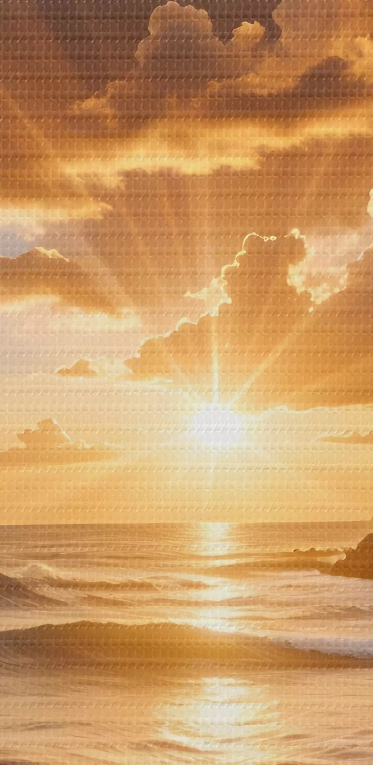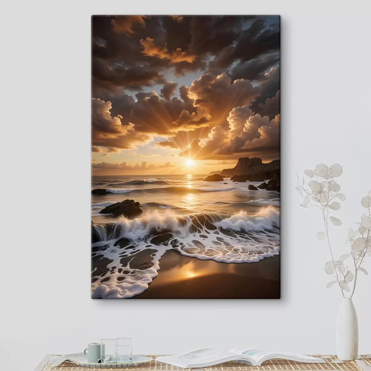 Maalid Dramaatiline päikeseloojang kaljuranniku kohal, lainete mürisemise ja dramaatiliste pilvedega taevas Nr s41245