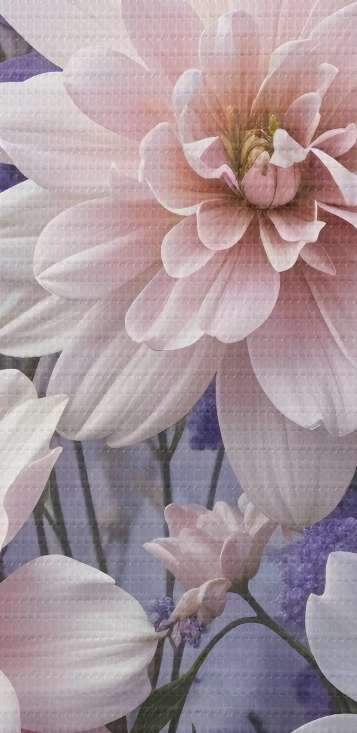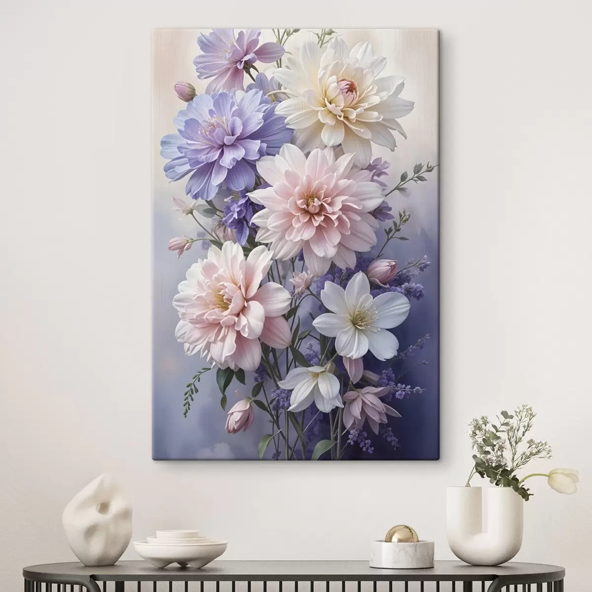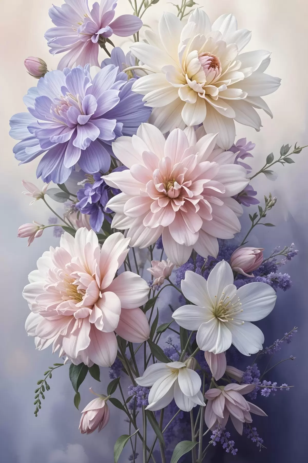 Maalid Suurtest, elujõulistest dahlialilledest koosnev kimp roosa, lavendli ja valge toonides pehmel, hägusel taustal Nr s41247