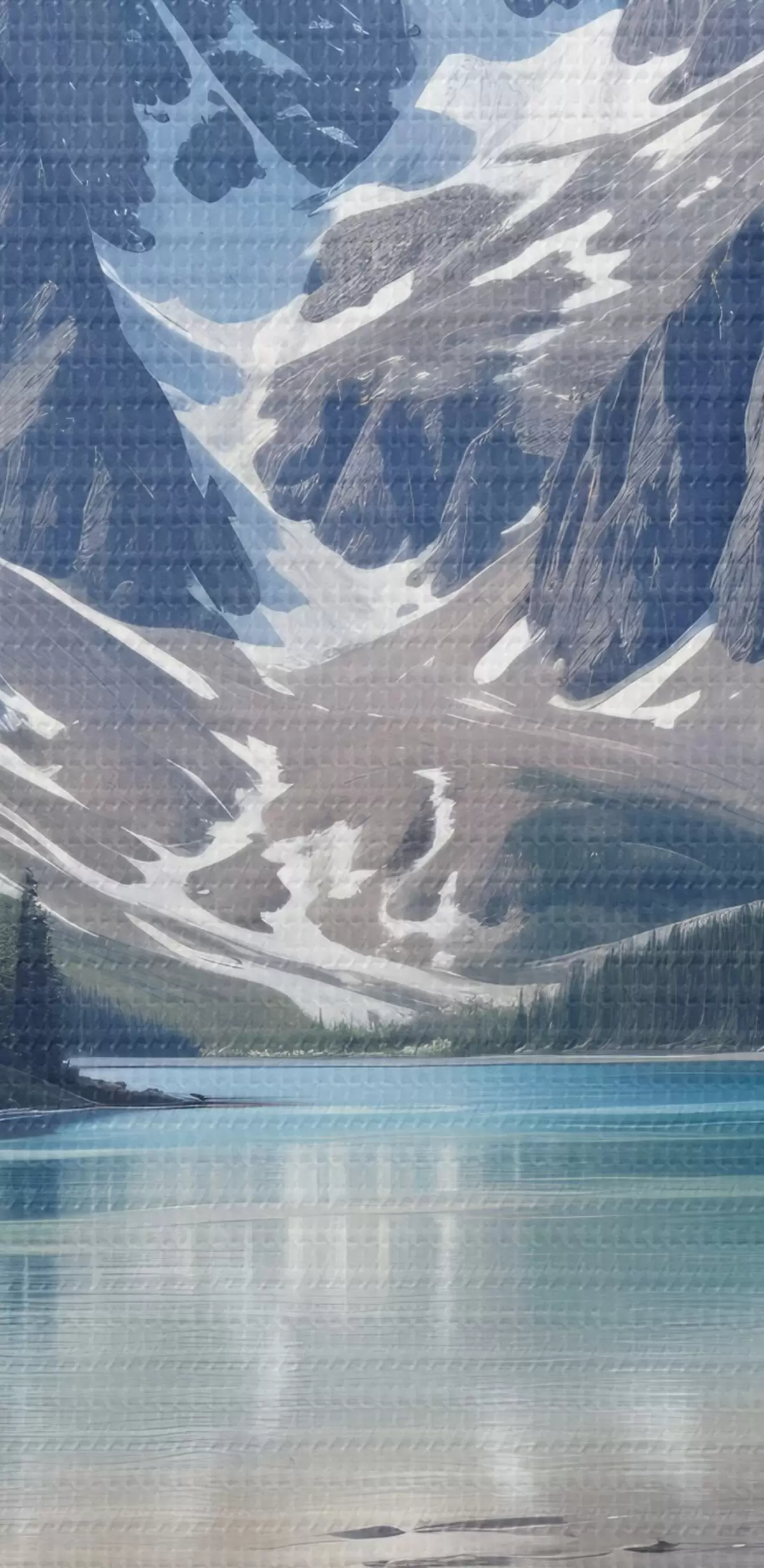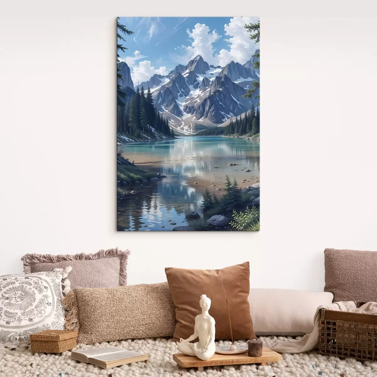 Maalid Rahulik alpi järv, mida ümbritsevad majesteetlikud lumekattega mäed, tiheda metsa ja pilvise taevaga Nr s41264