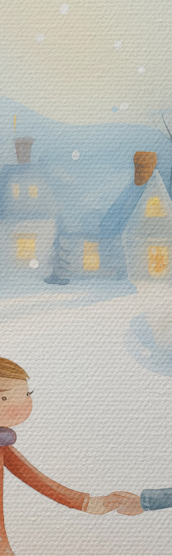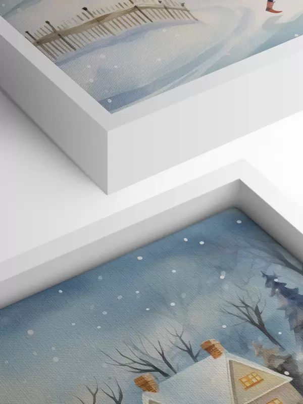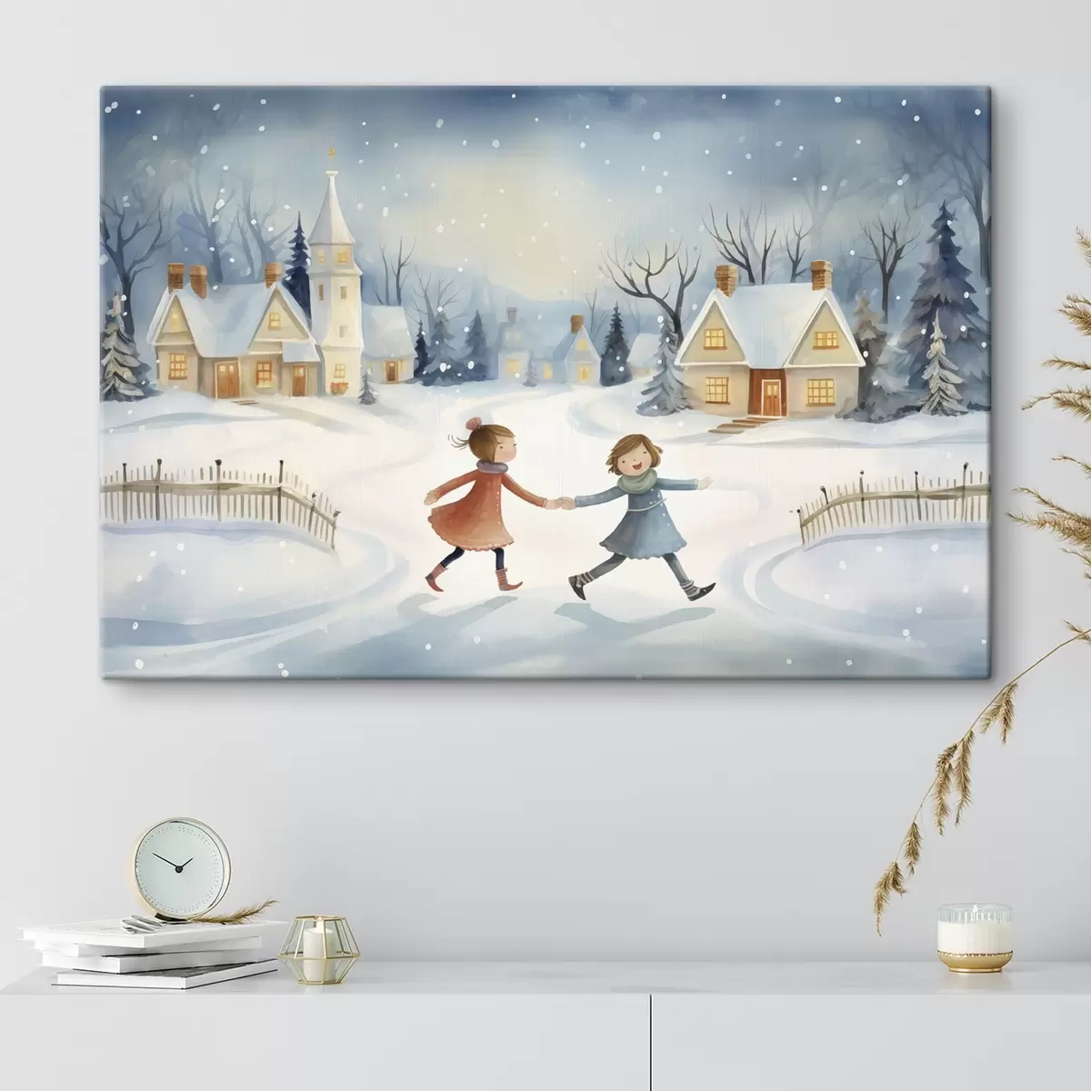 Maalid Tüdrukud talvekülas, lumehelbed, akvarell, majad, metsa Nr s41385