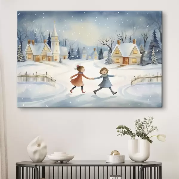 Maalid Tüdrukud talvekülas, lumehelbed, akvarell, majad, metsa Nr s41385