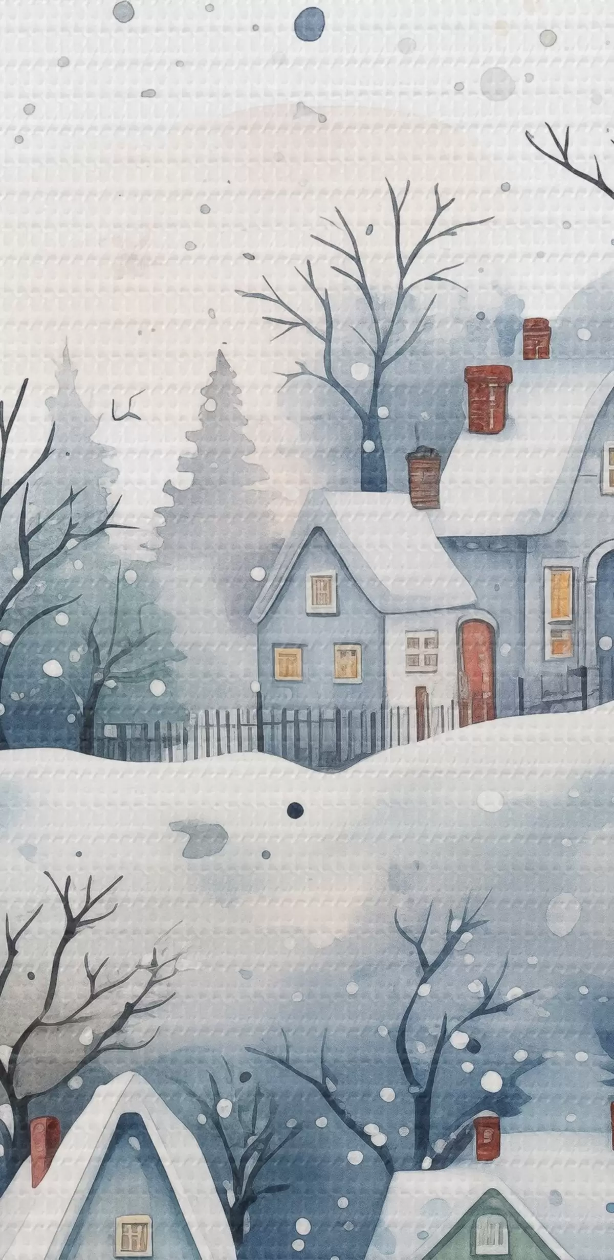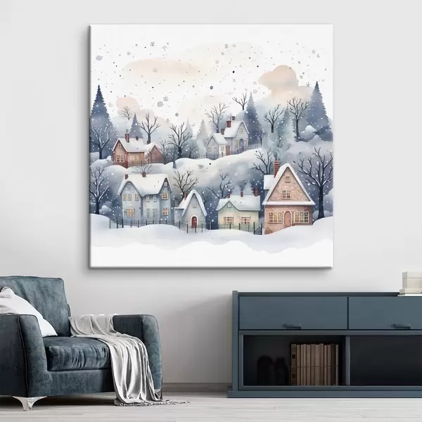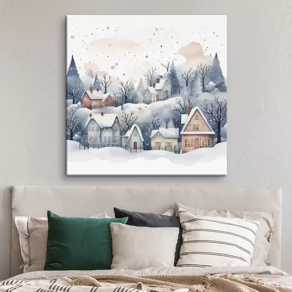Maalid Akvarell talvemaastik majade ja männimetsaga Nr s41389