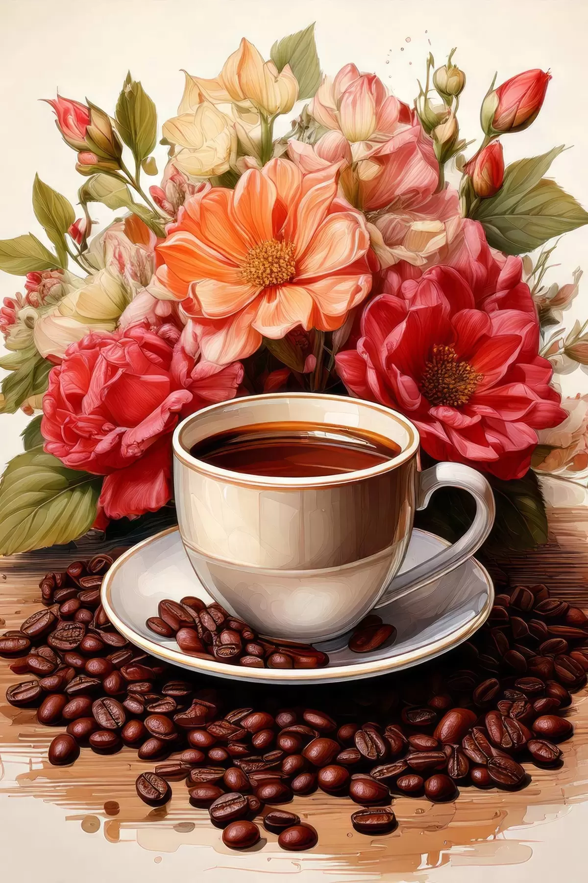 Maalid tassi kohvi ja lillekimbu Nr s41411