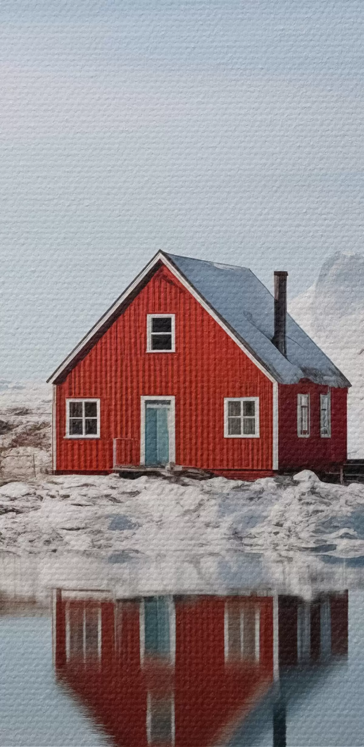 Maalid Minimalistlik talvemaastik punane maja järve ääres Nr s41437