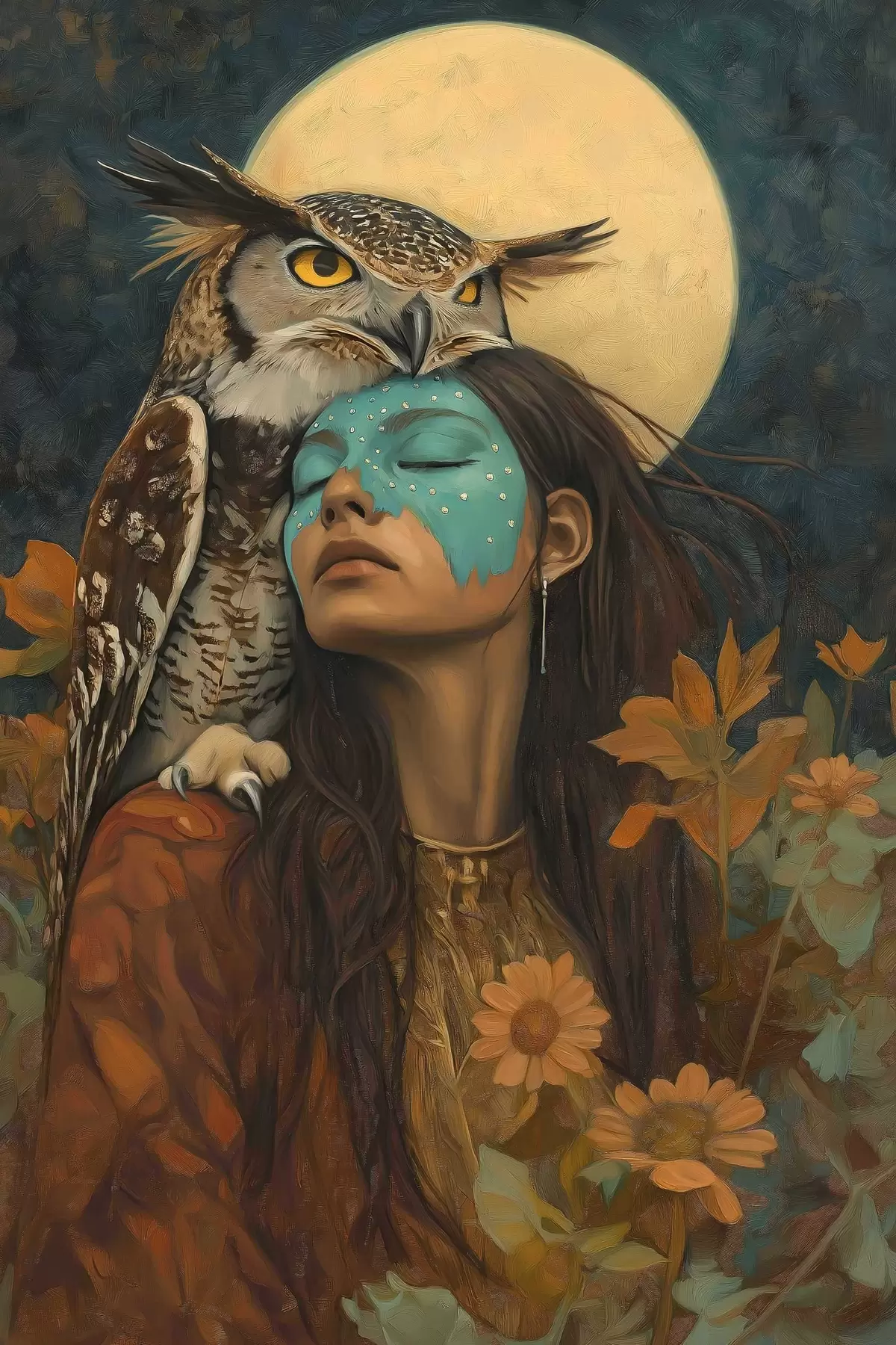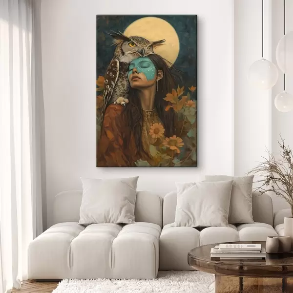 Maalid Naine koos öökulliga, hõimustiil, täiskuu, lilled Nr s41444