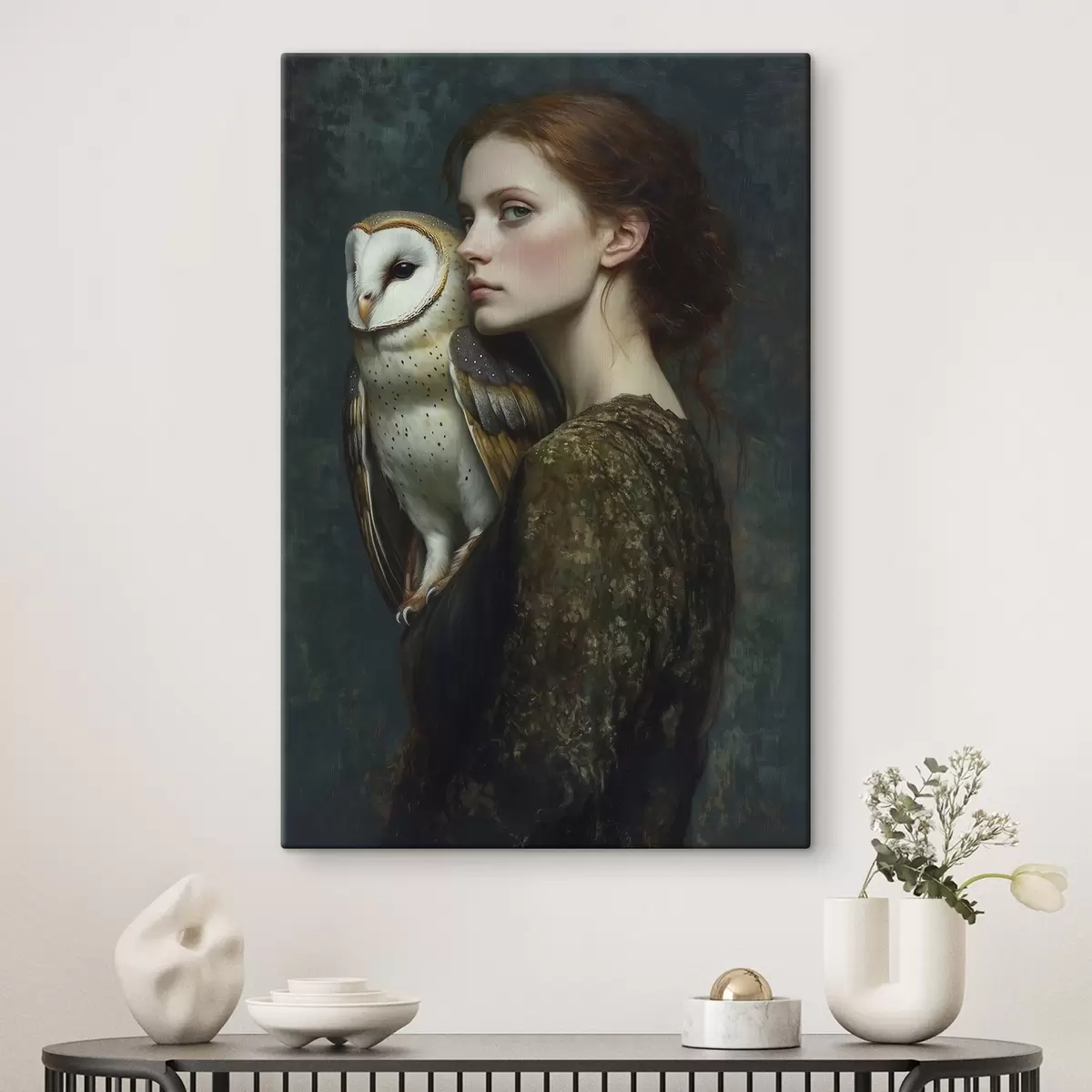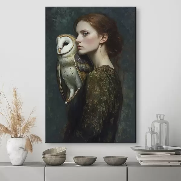 Maalid Naise portree öökullaga õlal, pintslitõmbed, akrüül Nr s41447