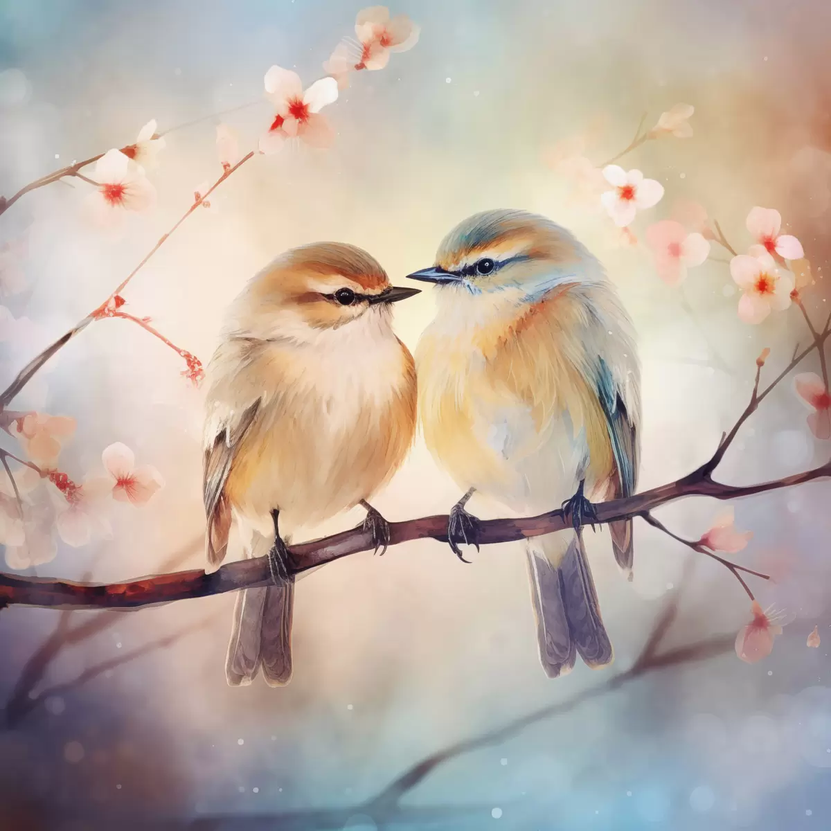 Maalid Paar linde istub õitsval oksal Nr s41476
