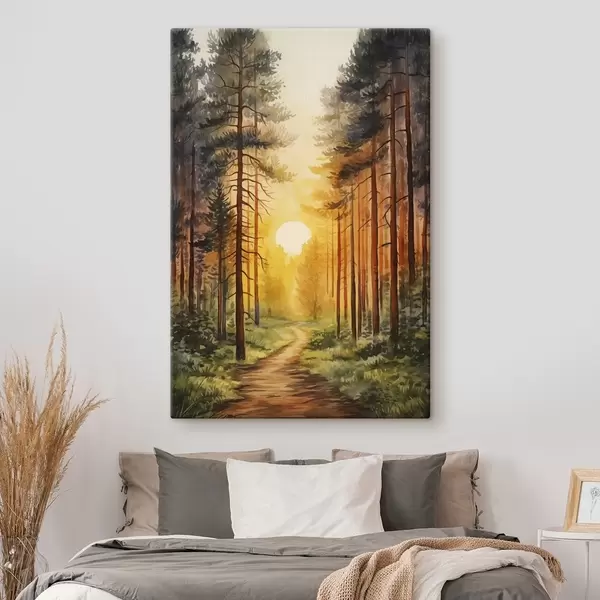 Maalid Päikeseloojang männimetsas, akvarell, looduse ilu Nr s41638