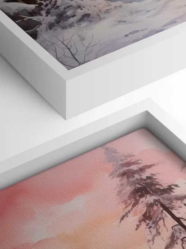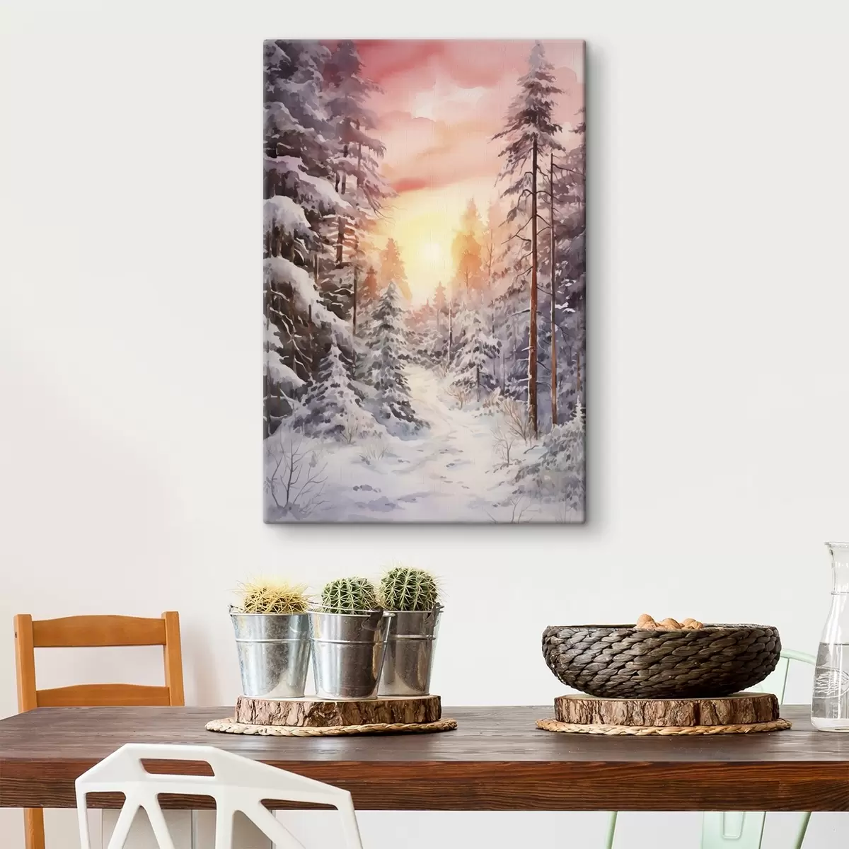 Maalid Ilus talv, akvarellmets, lumine, puud, roosa taevas, päikeseloojang Nr s41641