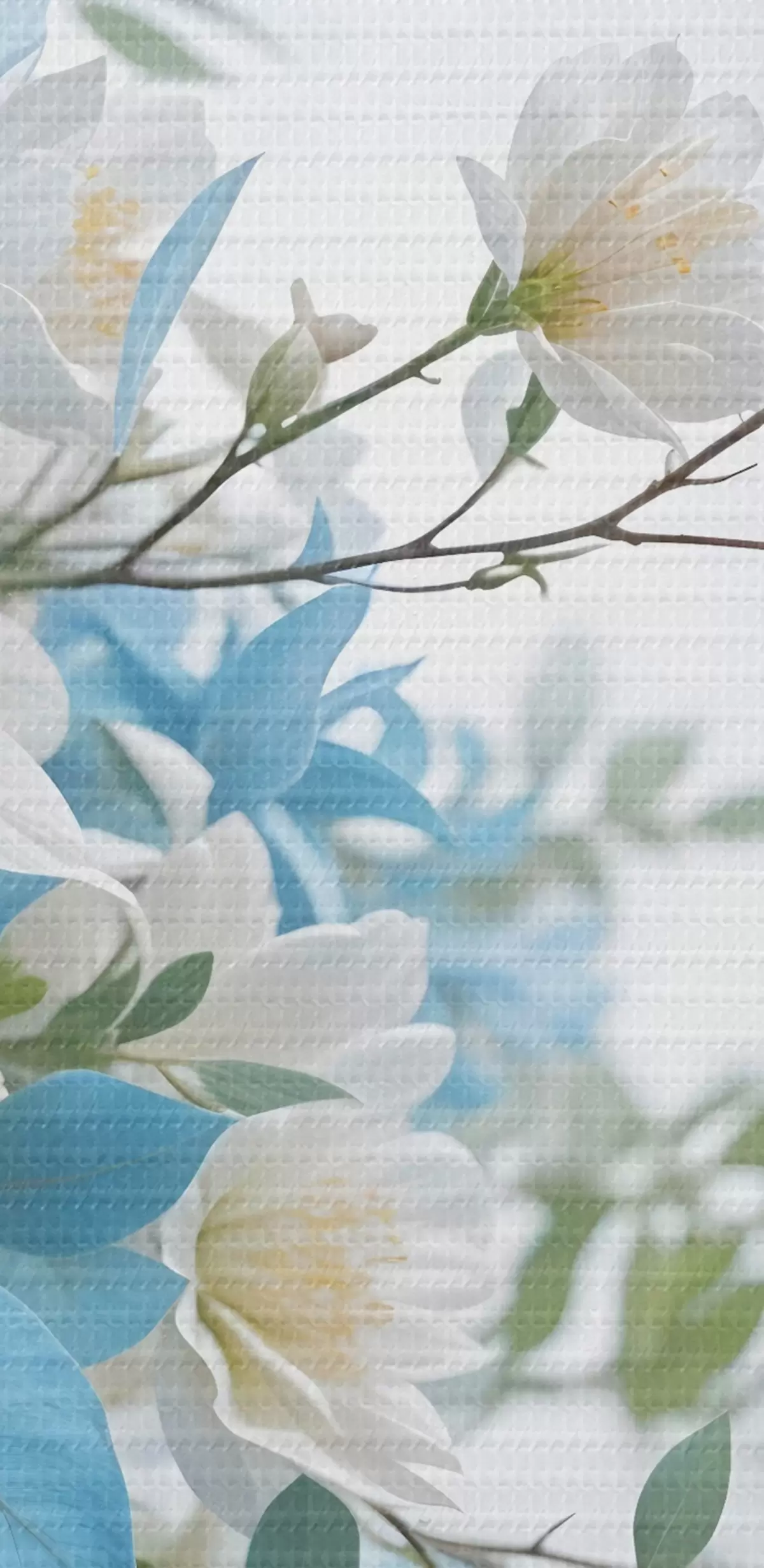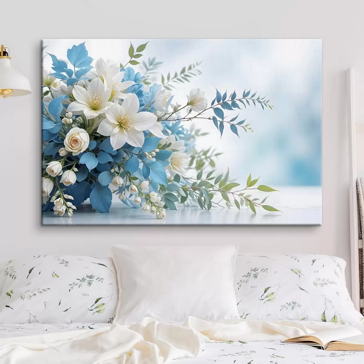 Maalid Valge ja sinine lillekimp koos roheliste lehtedega pehmel, hägusel taustal Nr s41715