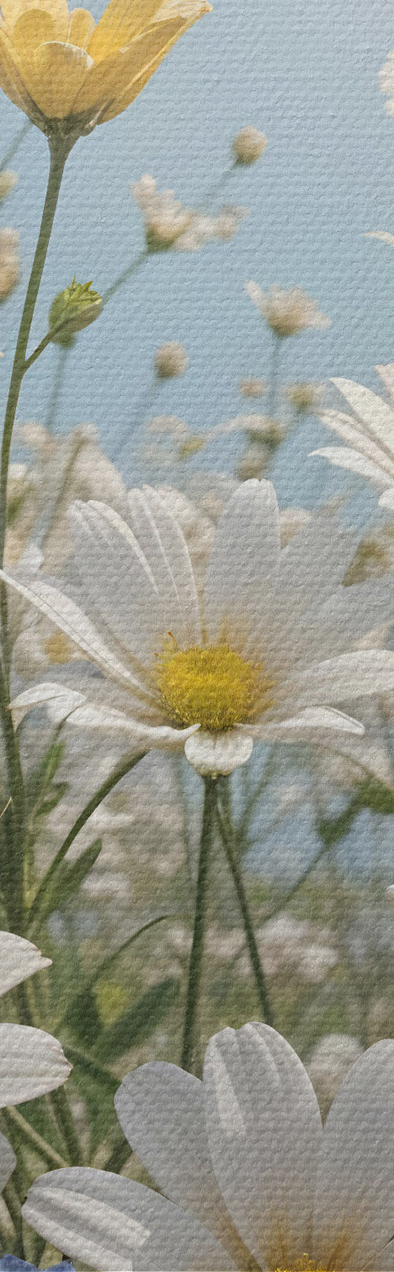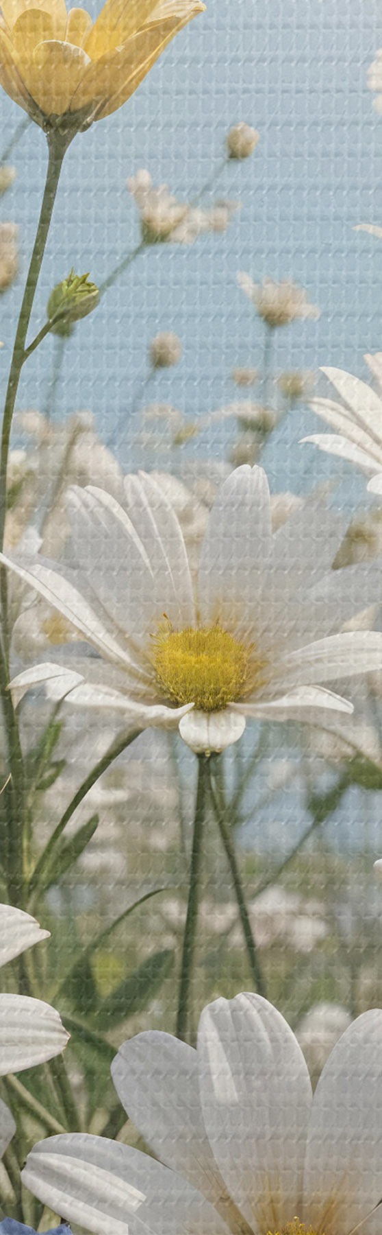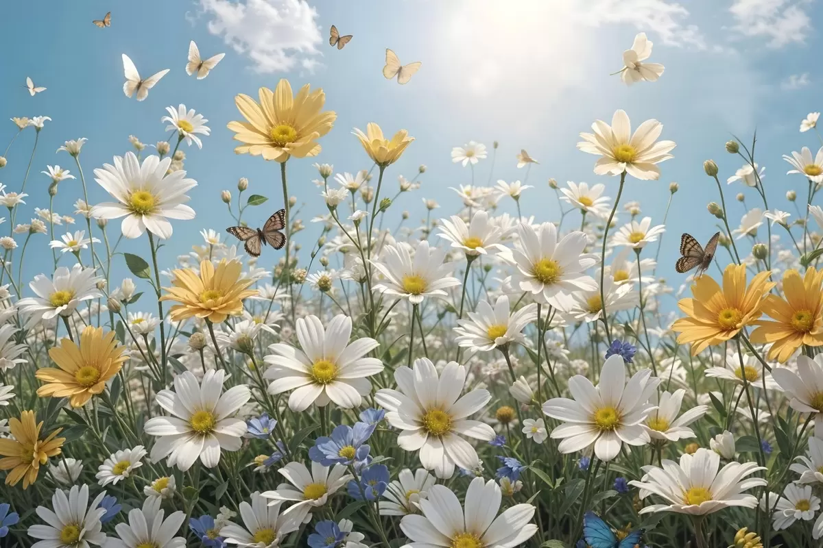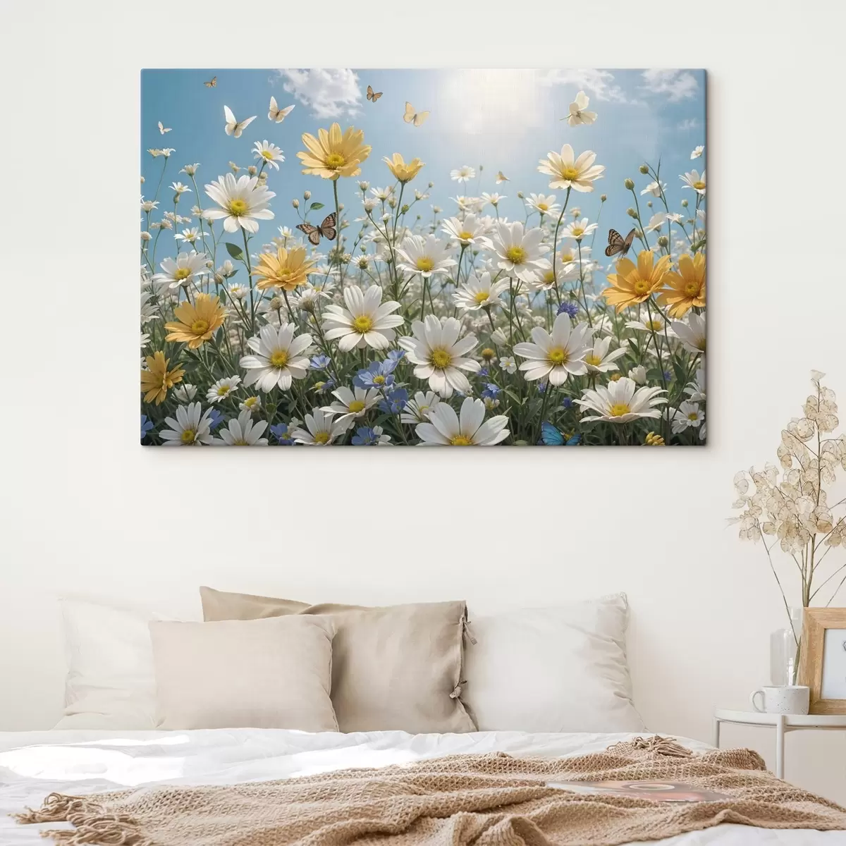 Maalid Valge ja kollane maratüünide väli sinise taeva taustal, mille kohal lendavad kohevad valged pilved ja liblikad Nr s41726