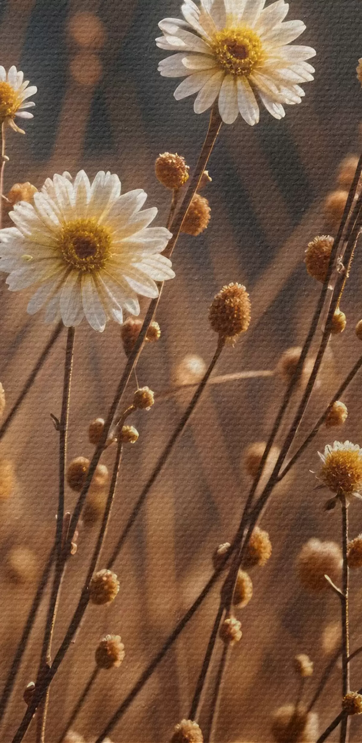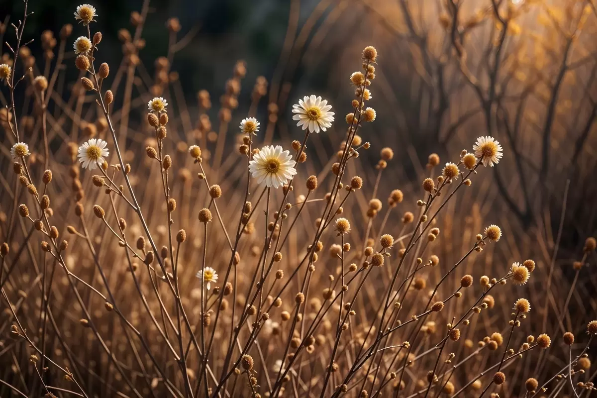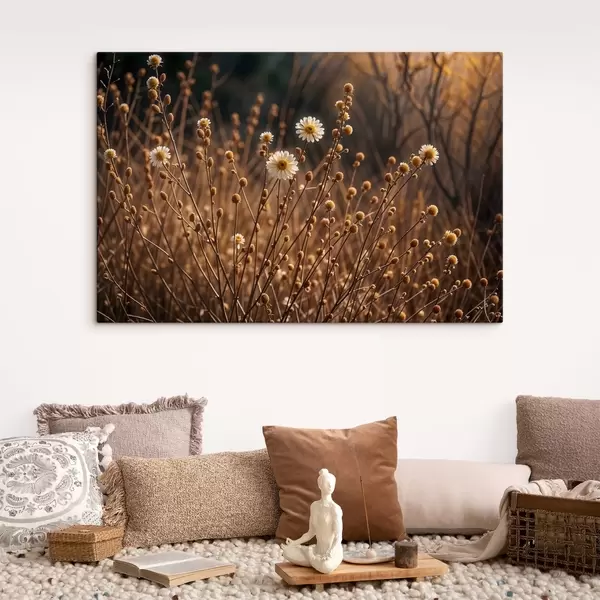Maalid Valged marekad kuivanud rohu ja varte väljal, sooja õhtupäikese valguses Nr s41735