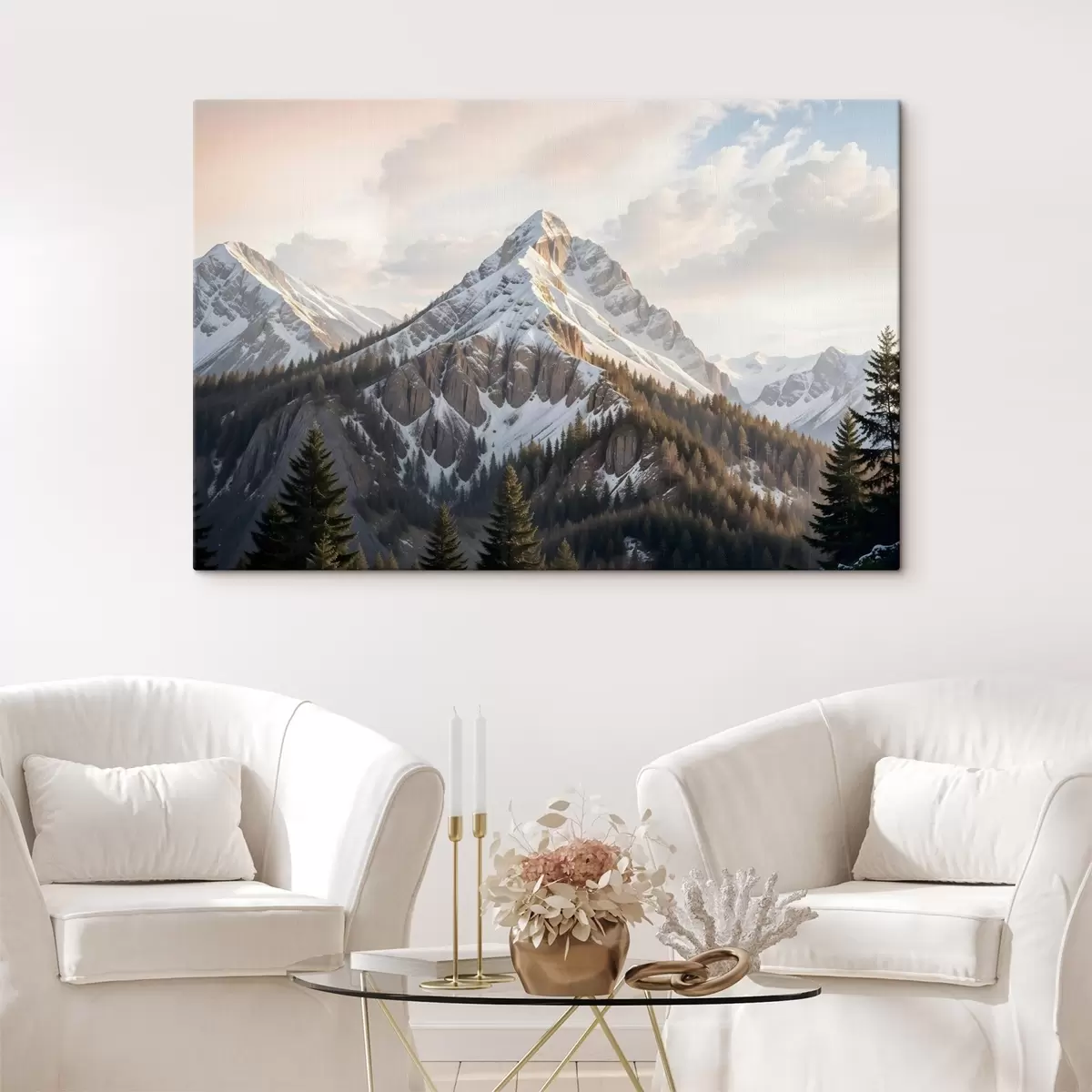 Maalid Lumekattega mäetipus, mis tõuseb üle metsase maastiku, esiplaanil mändid Nr s41736