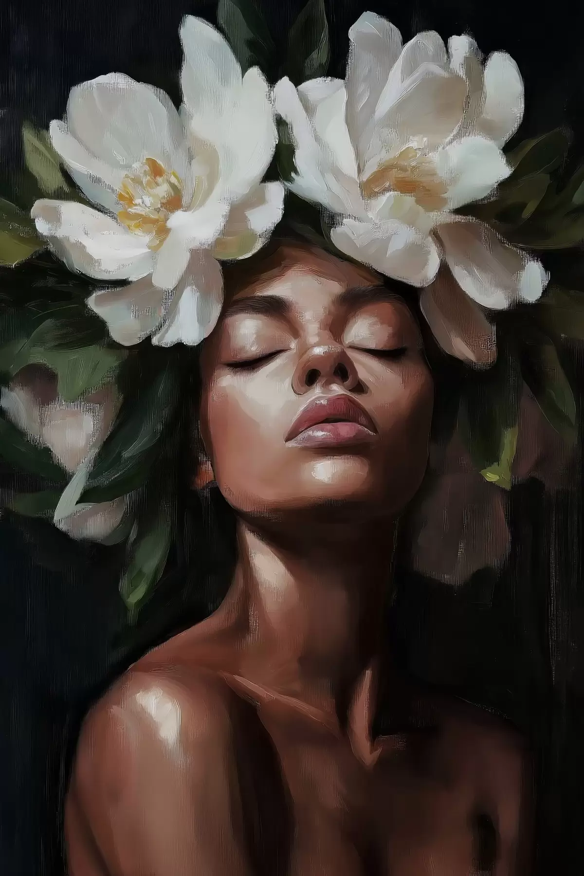Maalid Naisportree valge lilledega juustes tumedal taustal Nr s41824