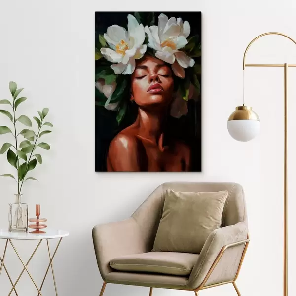 Maalid Naisportree valge lilledega juustes tumedal taustal Nr s41824